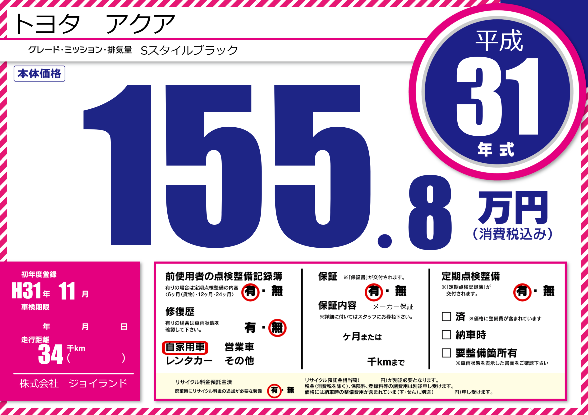 | 車名 | トヨタ アクア | グレード ミッション 排気量 |