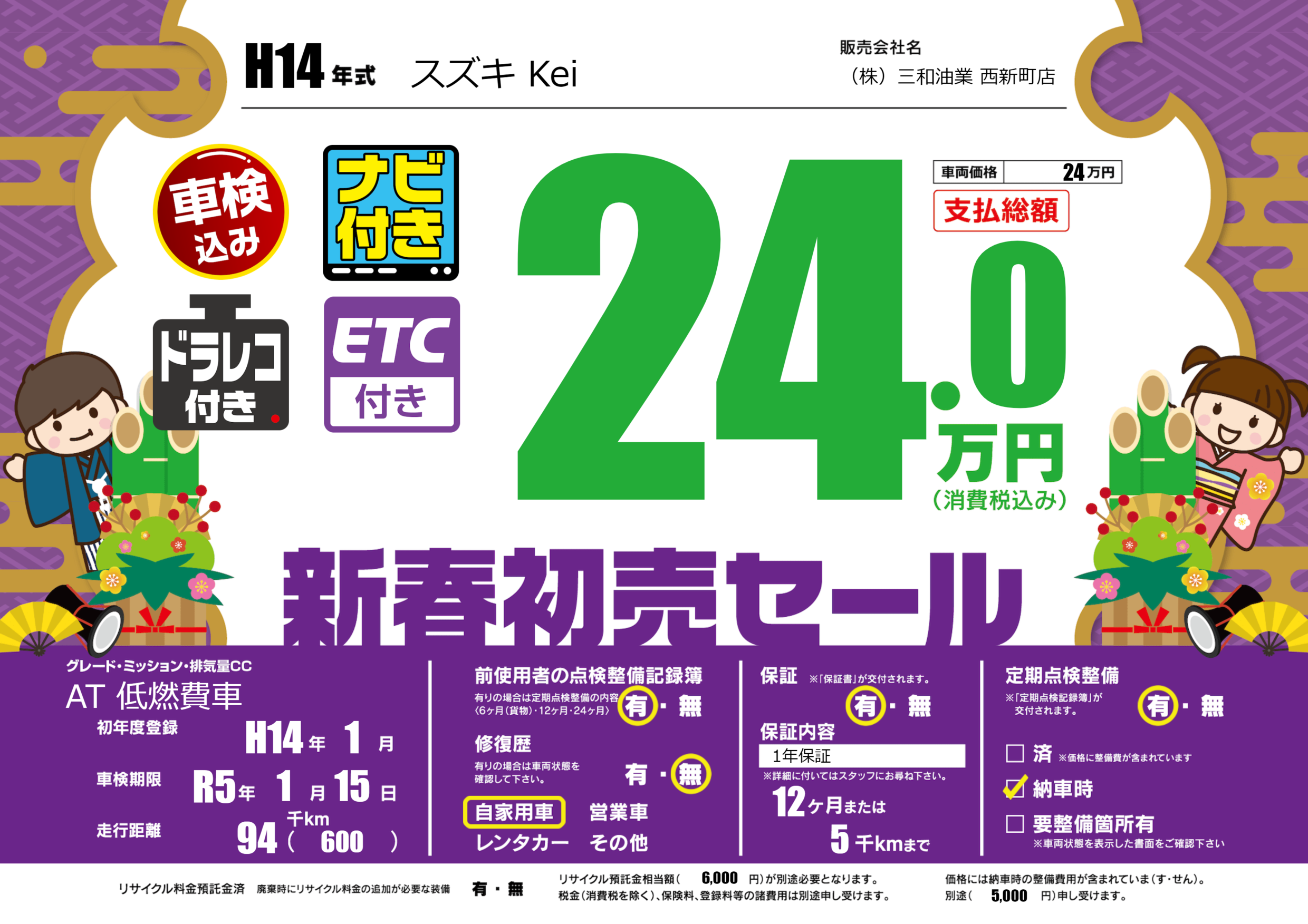 | 走行キロ | 9.4万km | 初年度登録 | H14年1月 |
