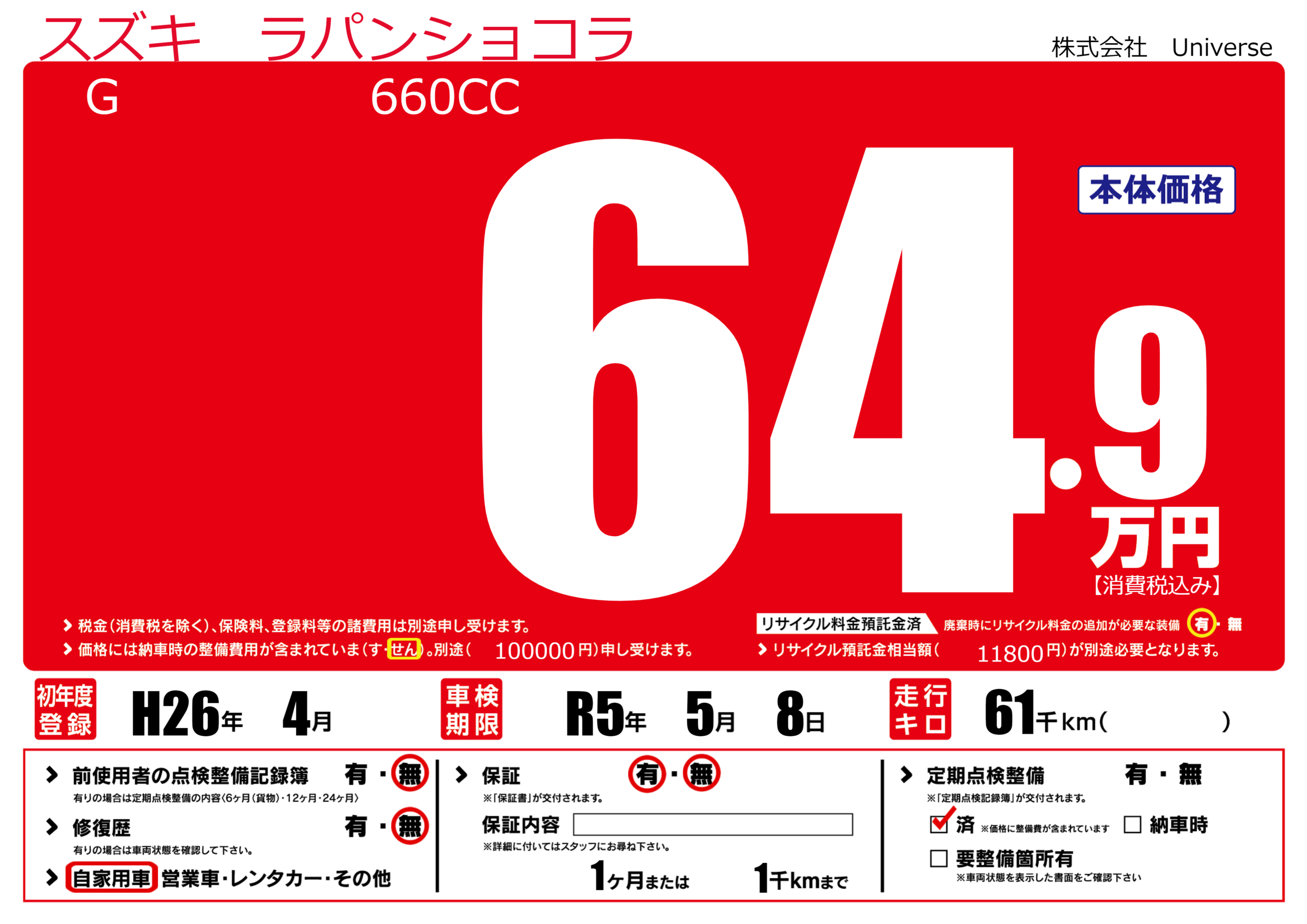 | 定期点検整備 | 定期点検整備済み | ||