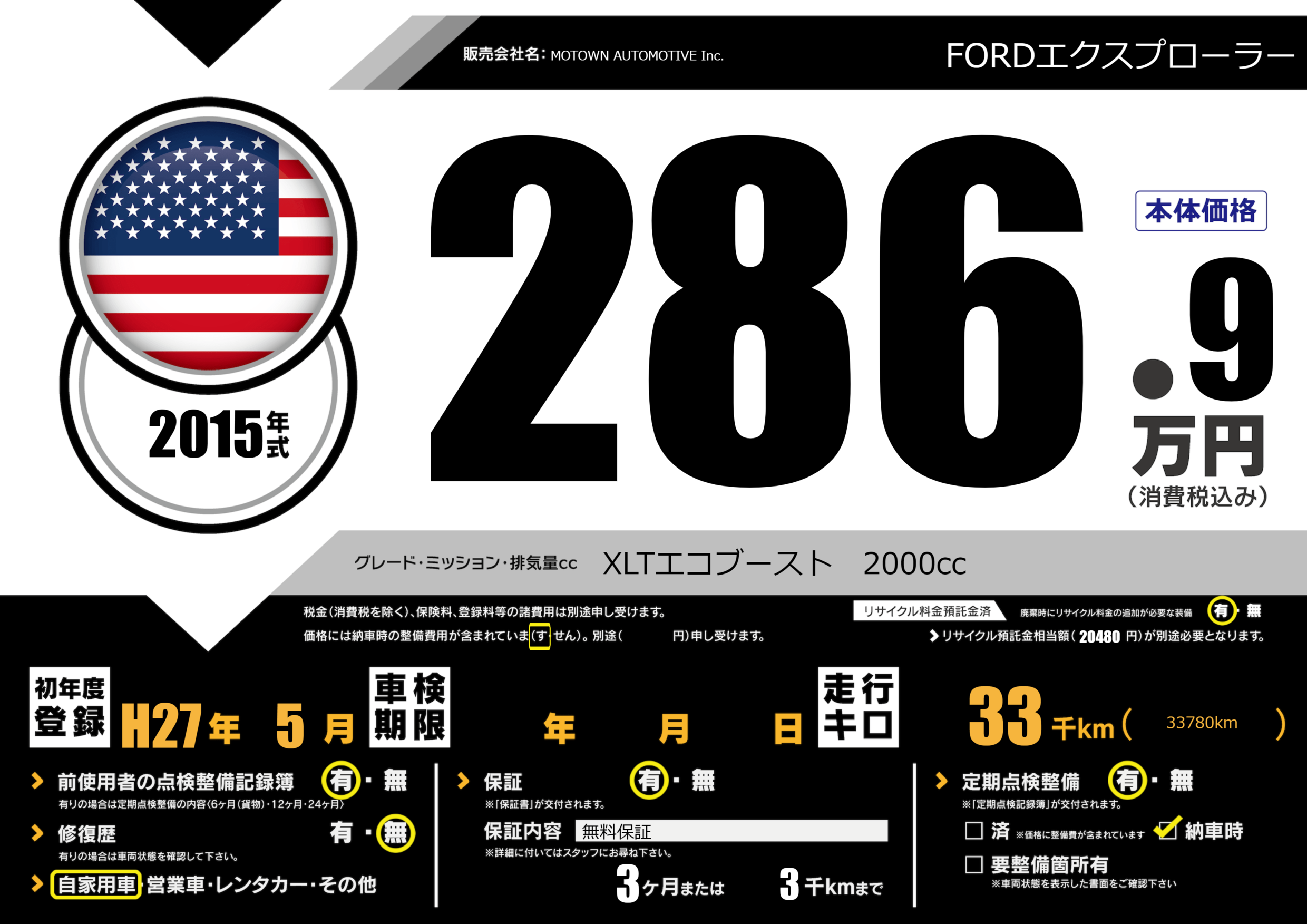 | 車名 | FORDエクスプローラー | グレード ミッション 排気量 |