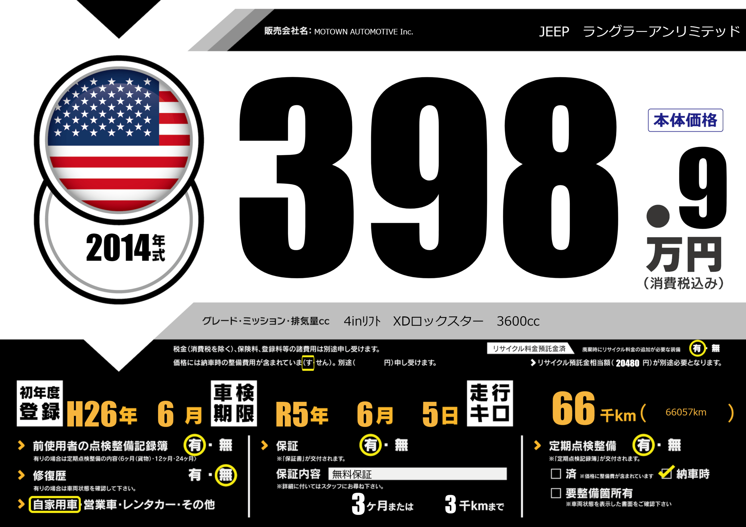 | 車名 | JEEP ラングラーアンリミテッド | グレード ミッション 排気量 |