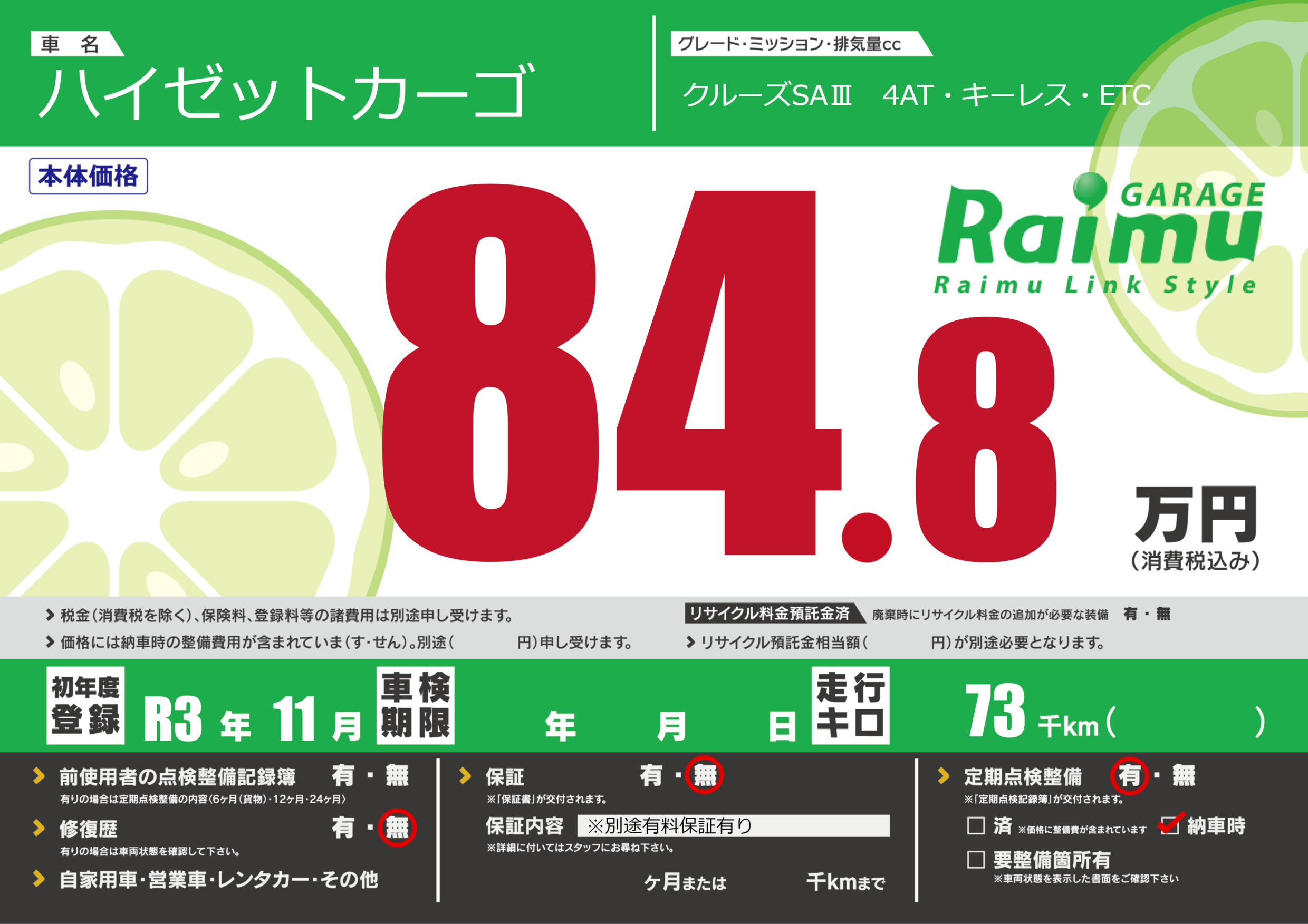 | 定期点検整備 | 定期点検整備あり 納車時あり | ||