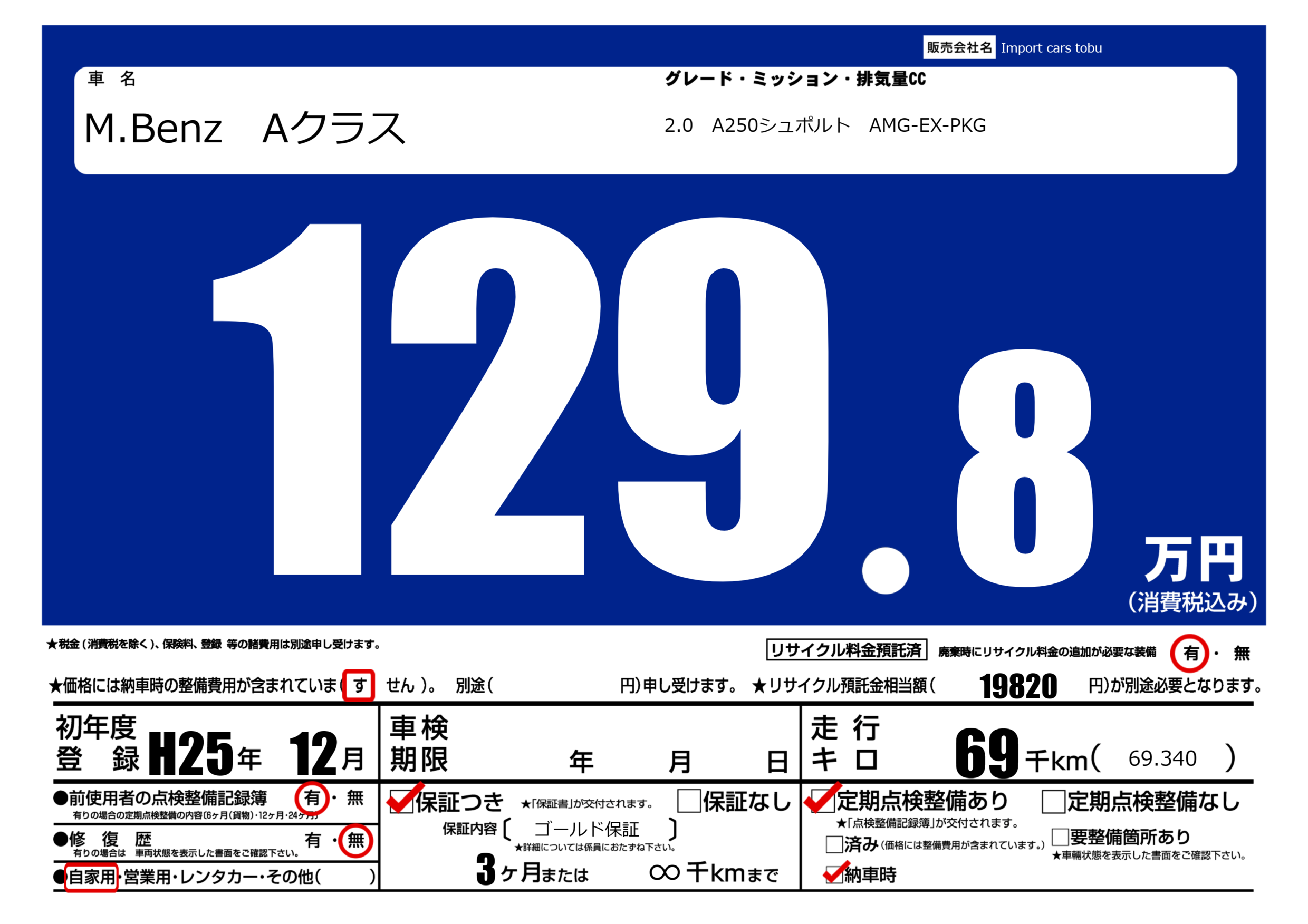 | 車名 | M.Benz Aクラス | グレード ミッション 排気量 |