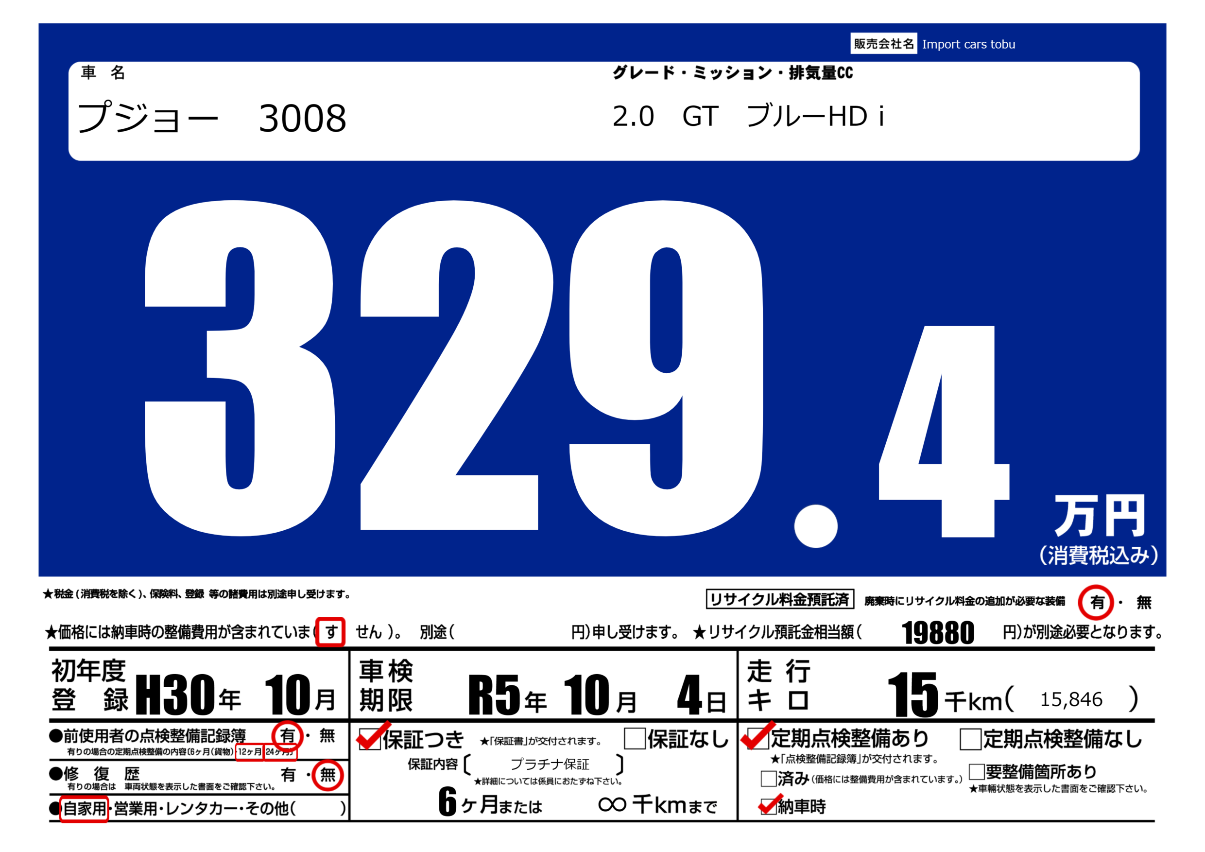 | 車名 | プジョー 3008 | グレード ミッション 排気量 |