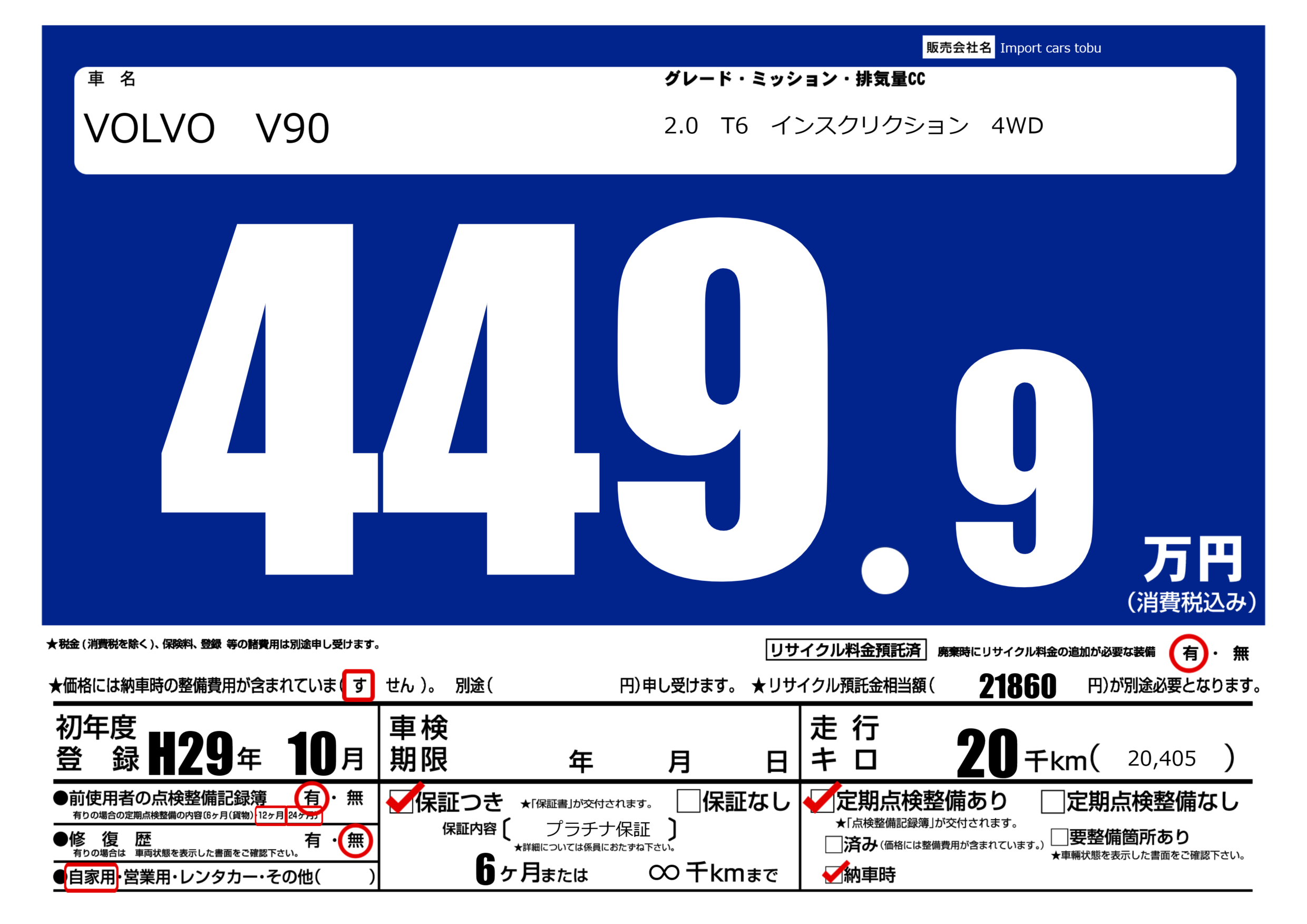 保証付き 保証内容( プラチナ保証) 6ヶ月または(∞)千kmまで |