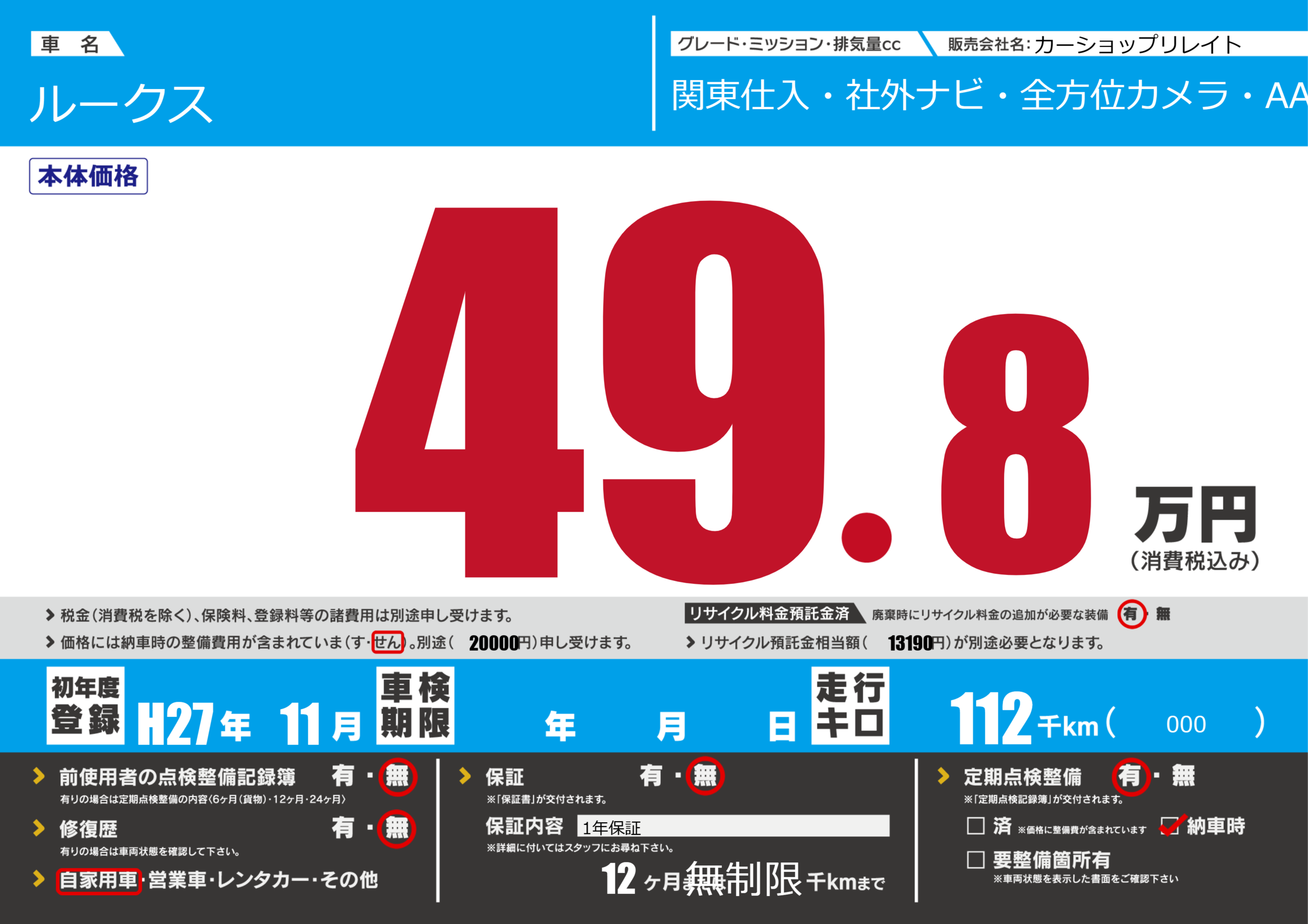 | 定期点検整備 | 定期点検整備あり 納車時あり | ||