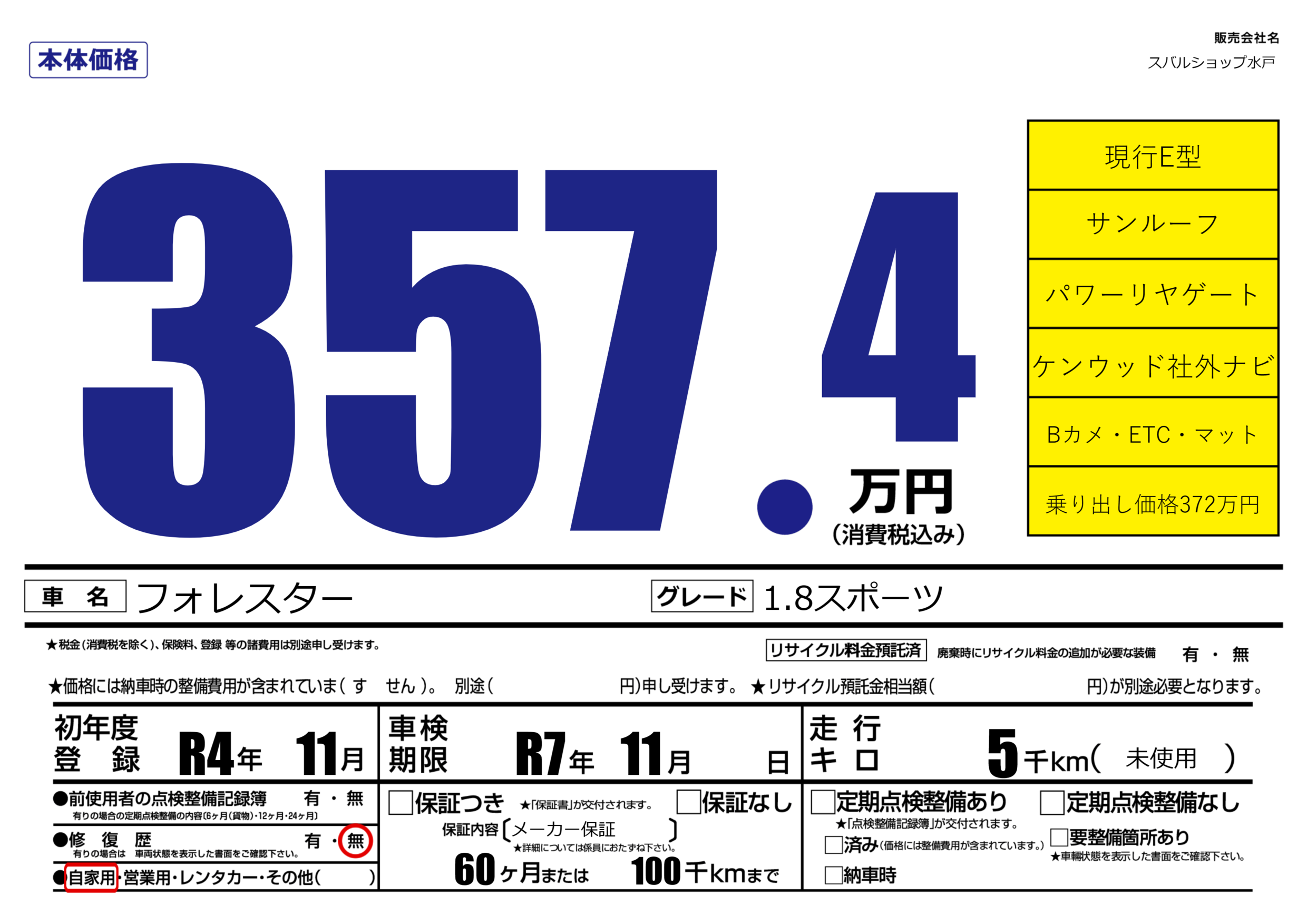| 車名 | フォレスター | グレード ミッション 排気量 |