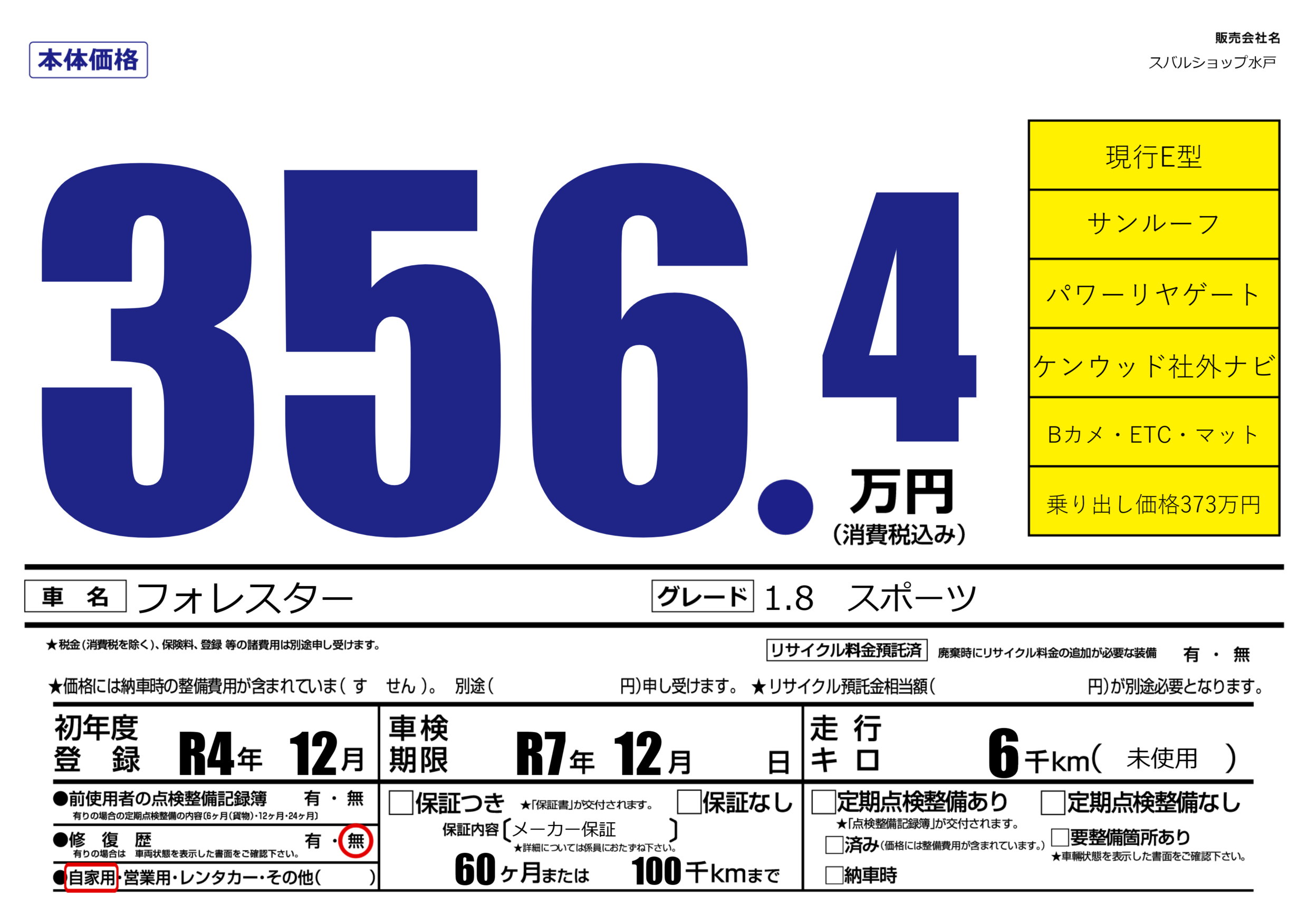 | 車名 | フォレスター | グレード ミッション 排気量 |