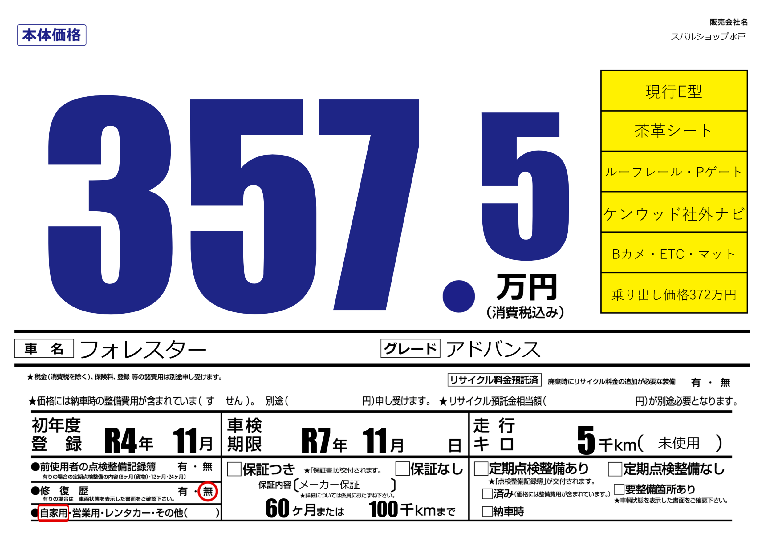 | 車名 | フォレスター | グレード ミッション 排気量 |