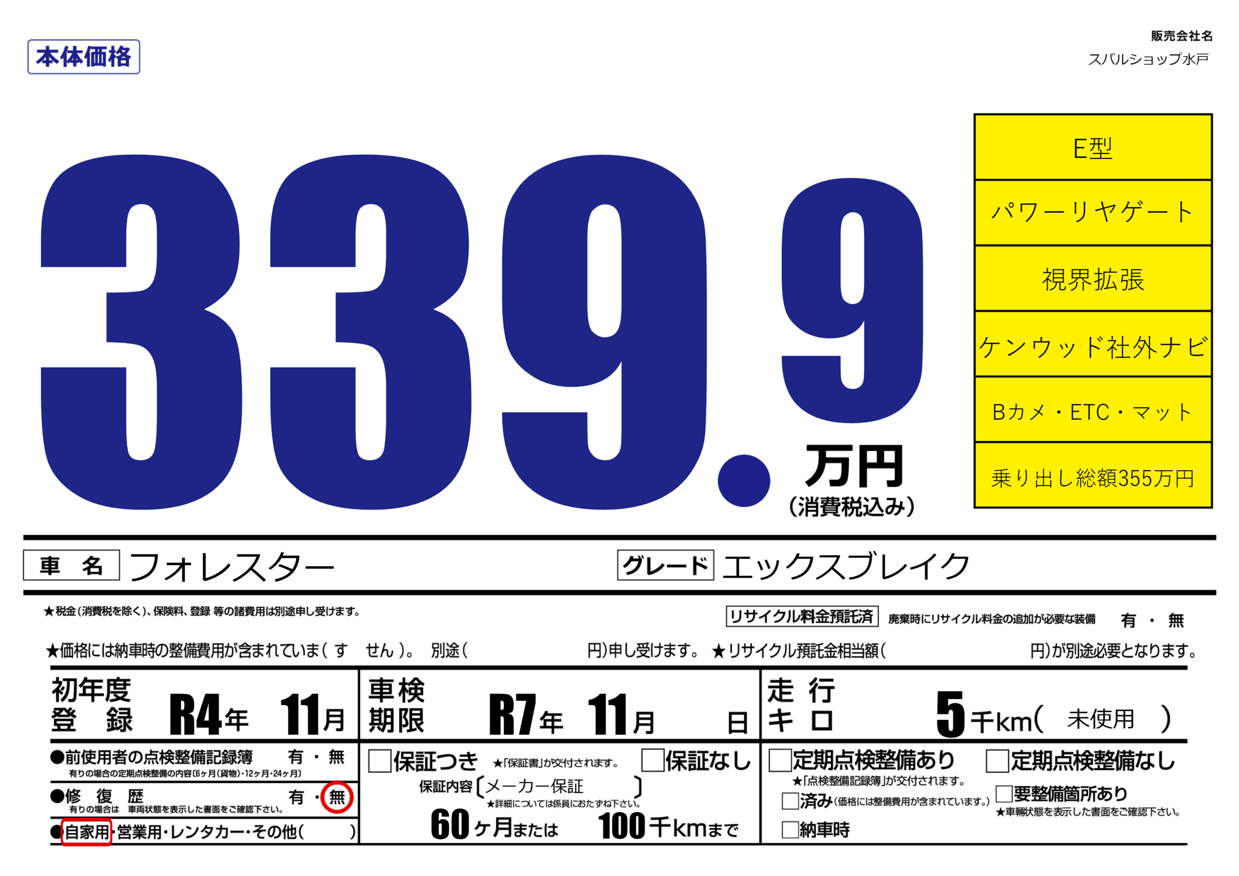| 車名 | フォレスター | グレード ミッション 排気量 |