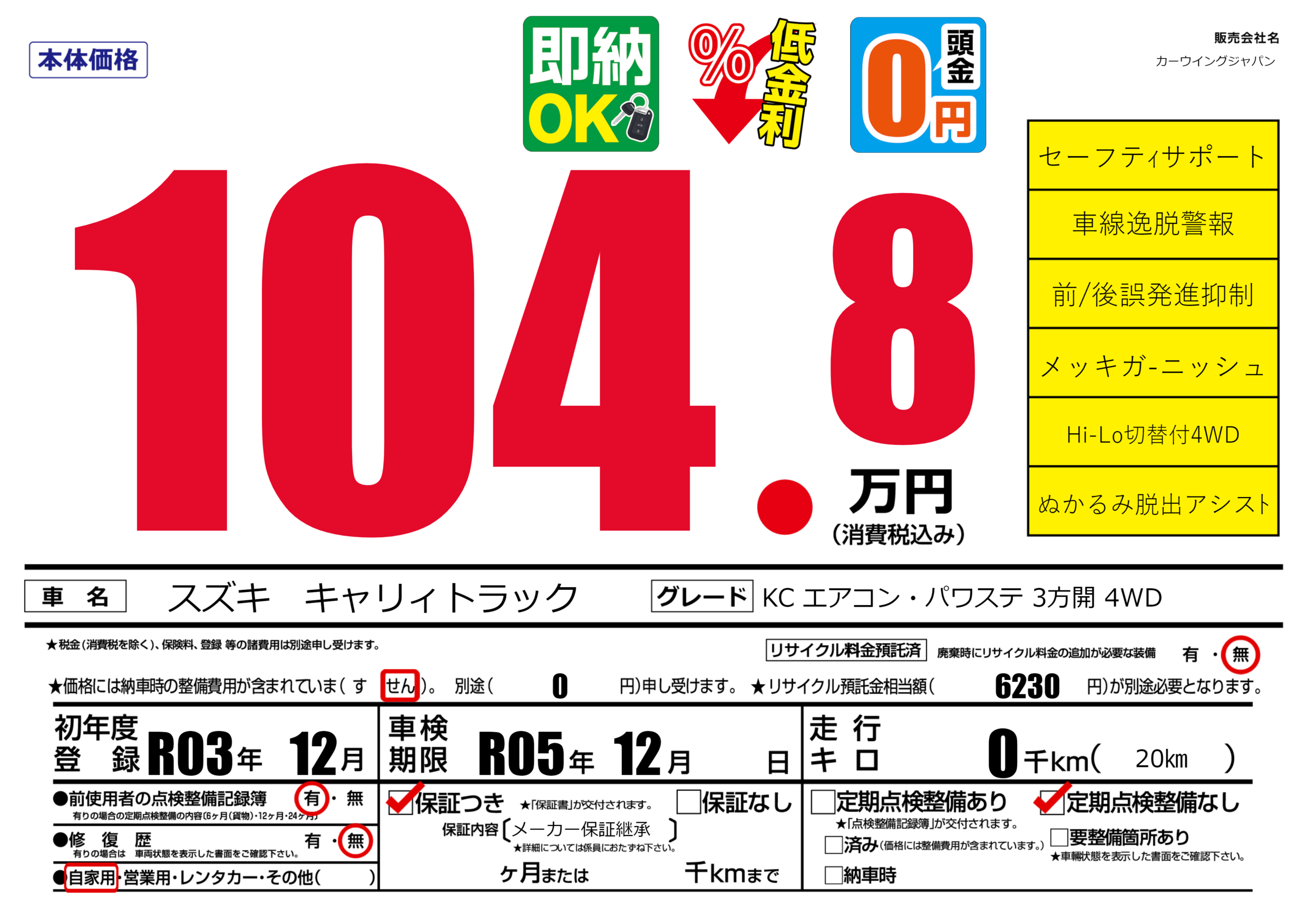 | 車名 | スズキ キャリィトラック | グレード ミッション 排気量 |