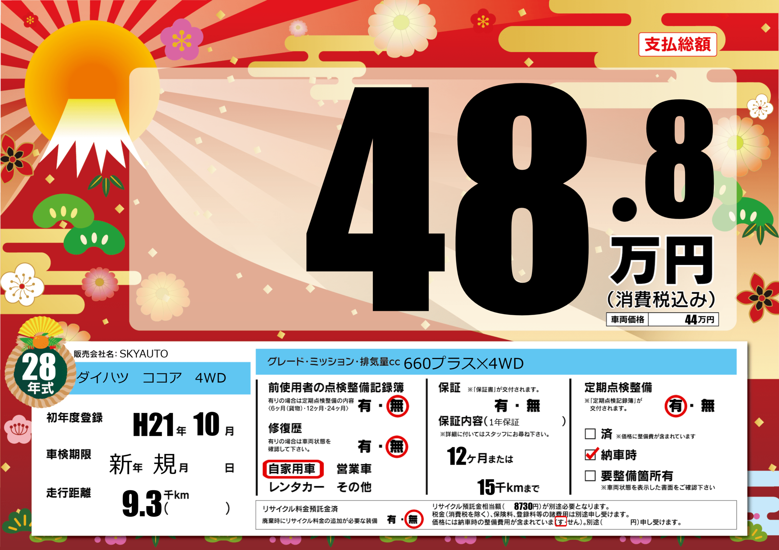 | 走行キロ | 0.9万km | 初年度登録 | H21年10月 |