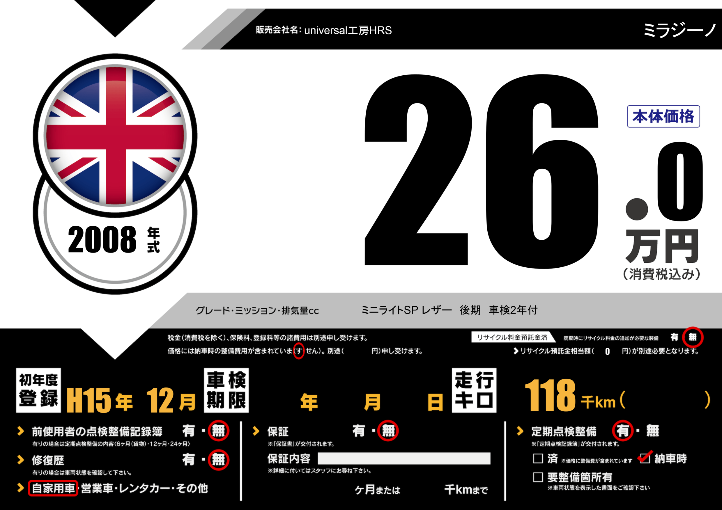 | 走行キロ | 11.8万km | 初年度登録 | H15年12月 |