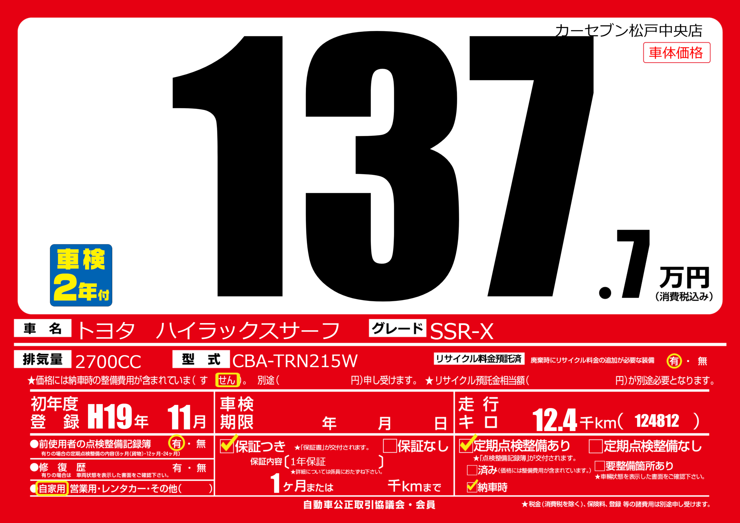 保証付き 保証内容(1年保証) 1ヶ月または()千kmまで |