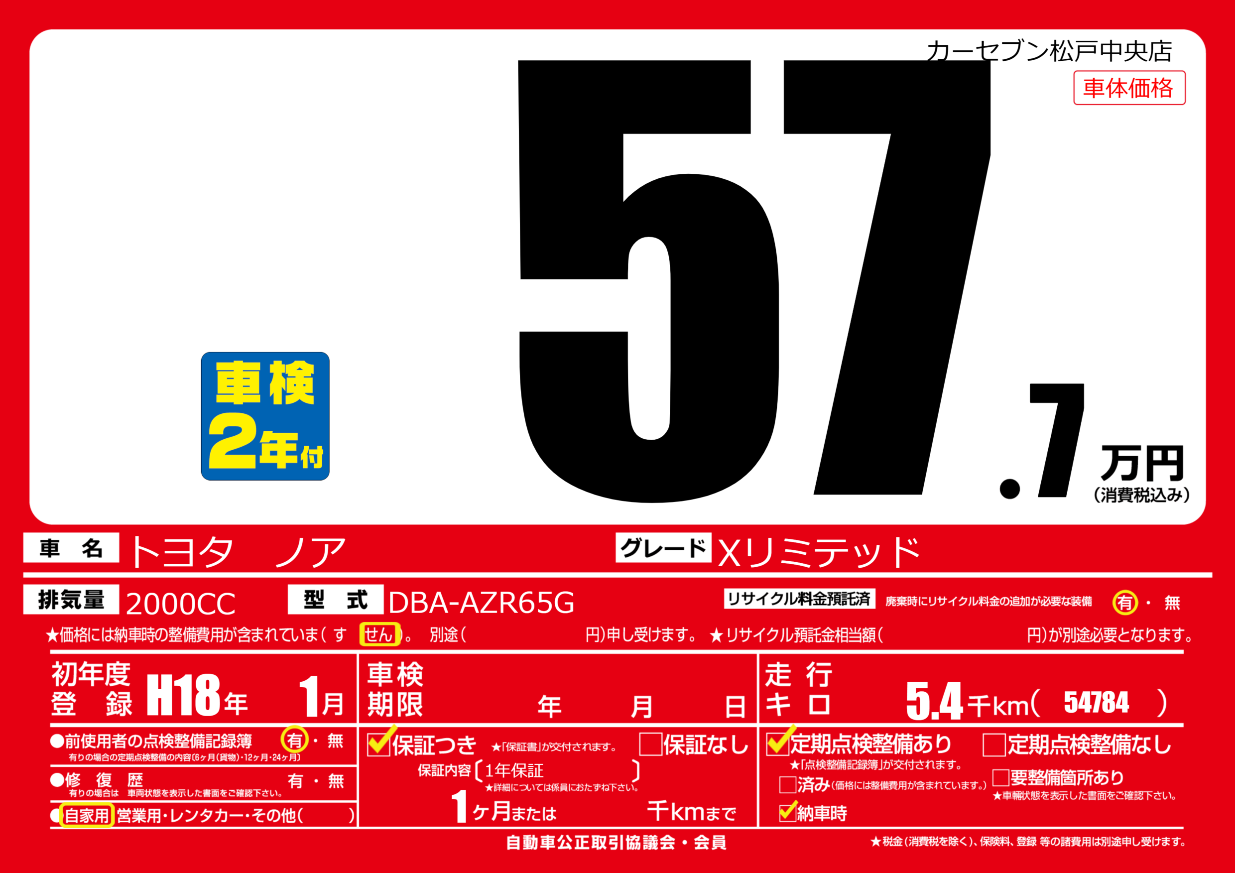 | 走行キロ | 0.5万km | 初年度登録 | H18年1月 |