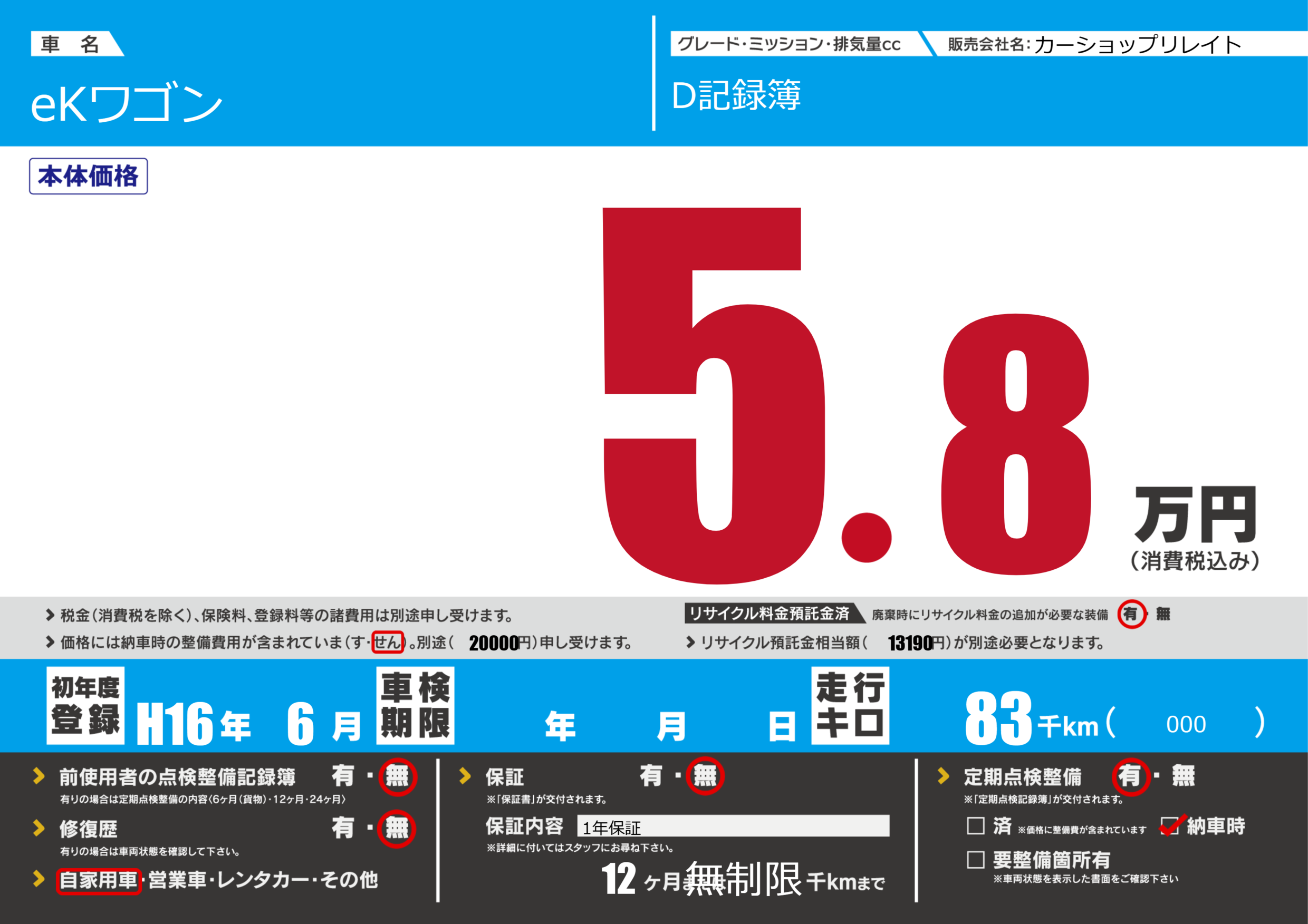 | 車名 | eKワゴン | グレード ミッション 排気量 |