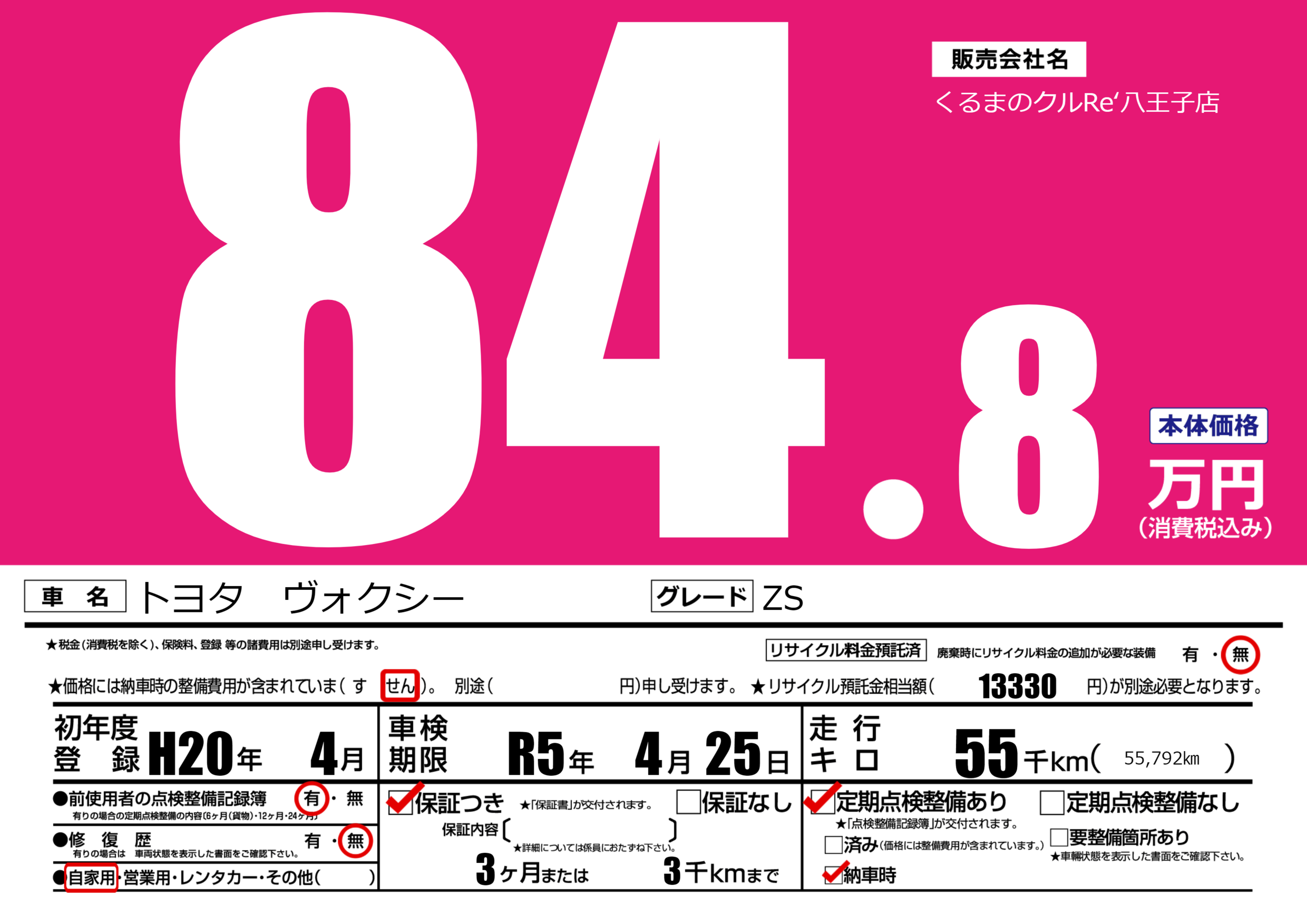 | 車名 | トヨタ ヴォクシー | グレード ミッション 排気量 |