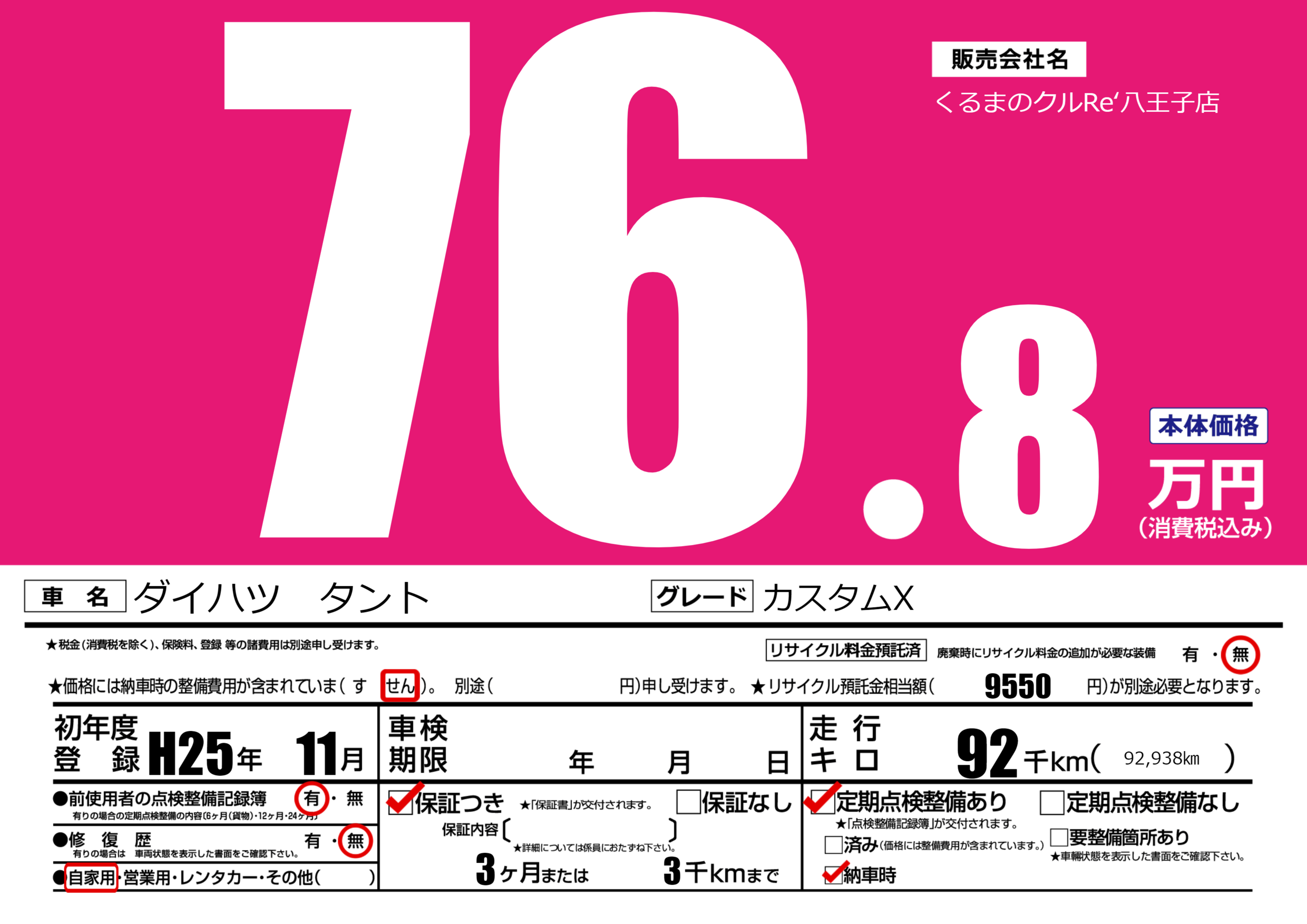 保証付き 保証内容(---) 3ヶ月または(3)千kmまで |