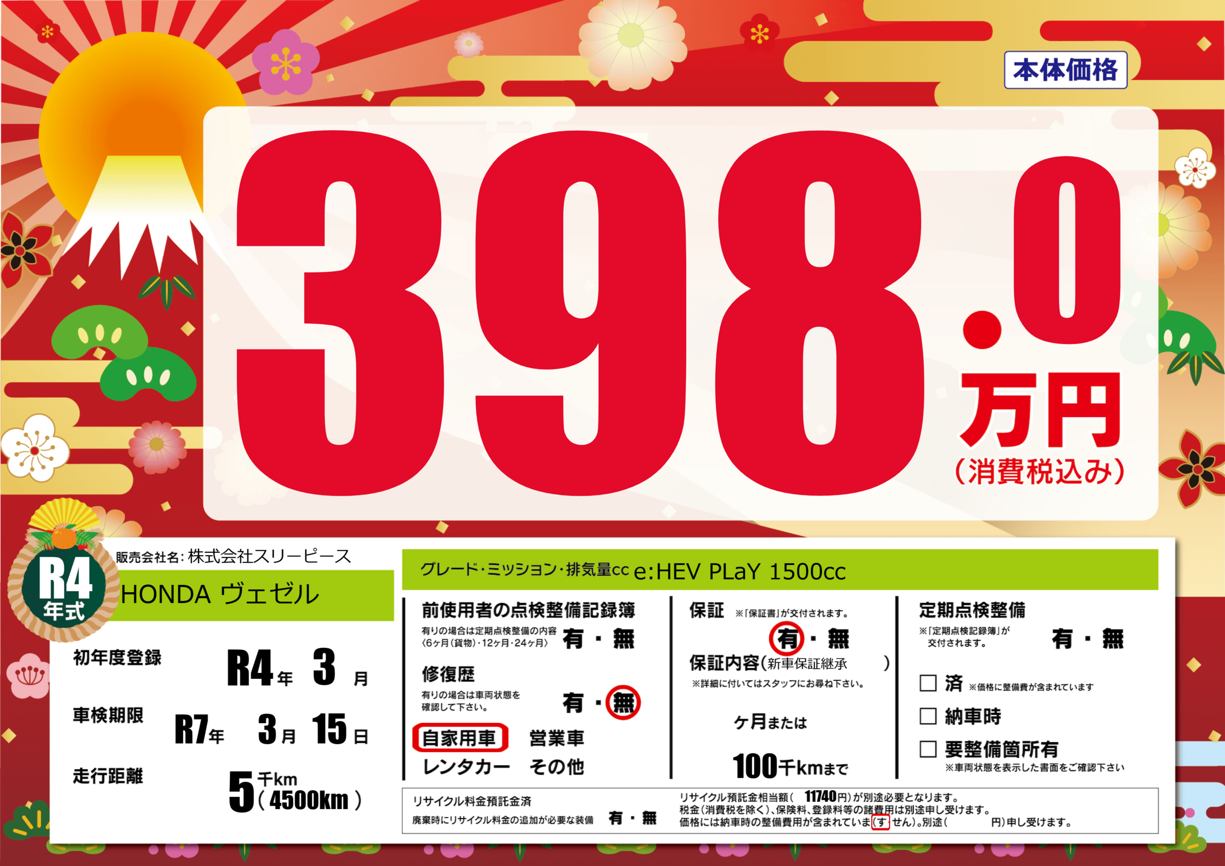 | 車名 | HONDA ヴェゼル | グレード ミッション 排気量 |