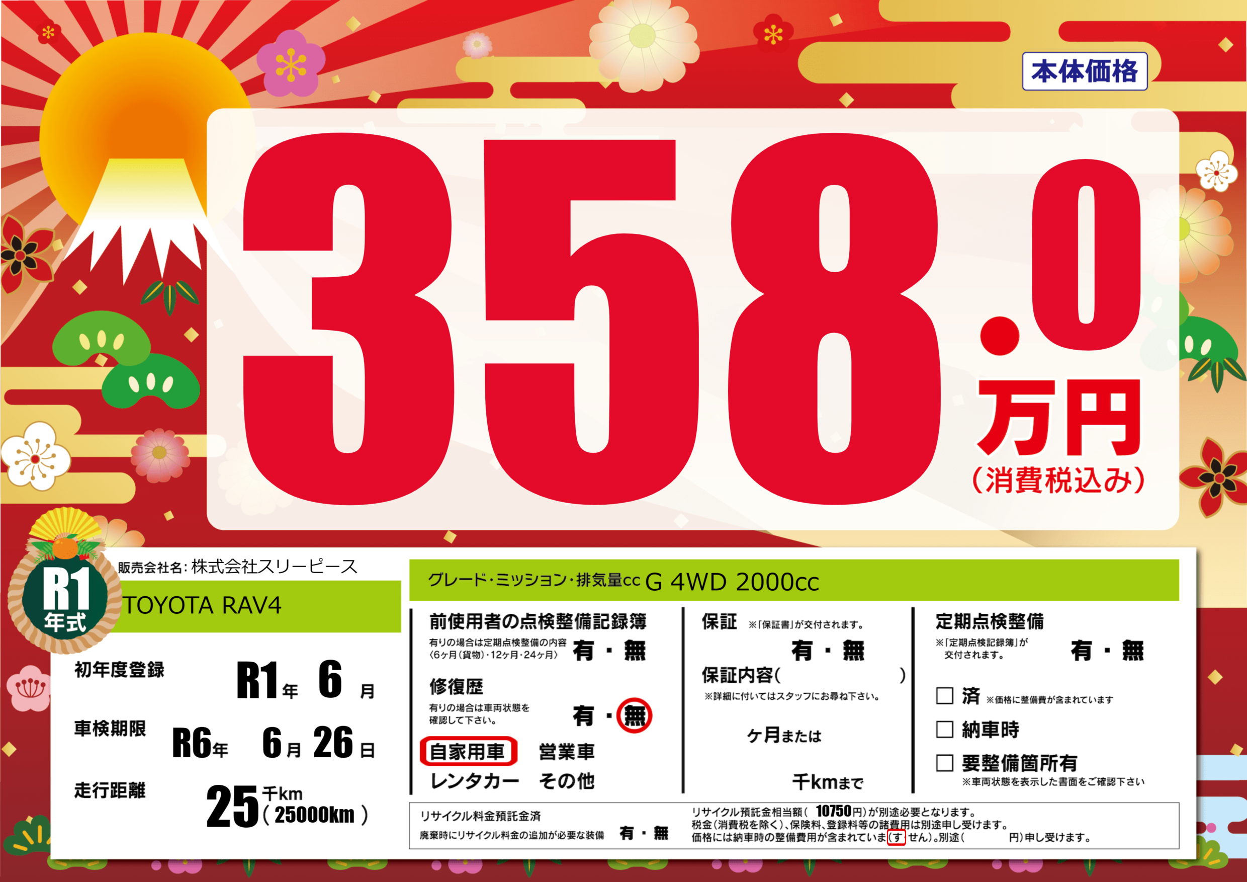 | 車名 | TOYOTA RAV4 | グレード ミッション 排気量 |
