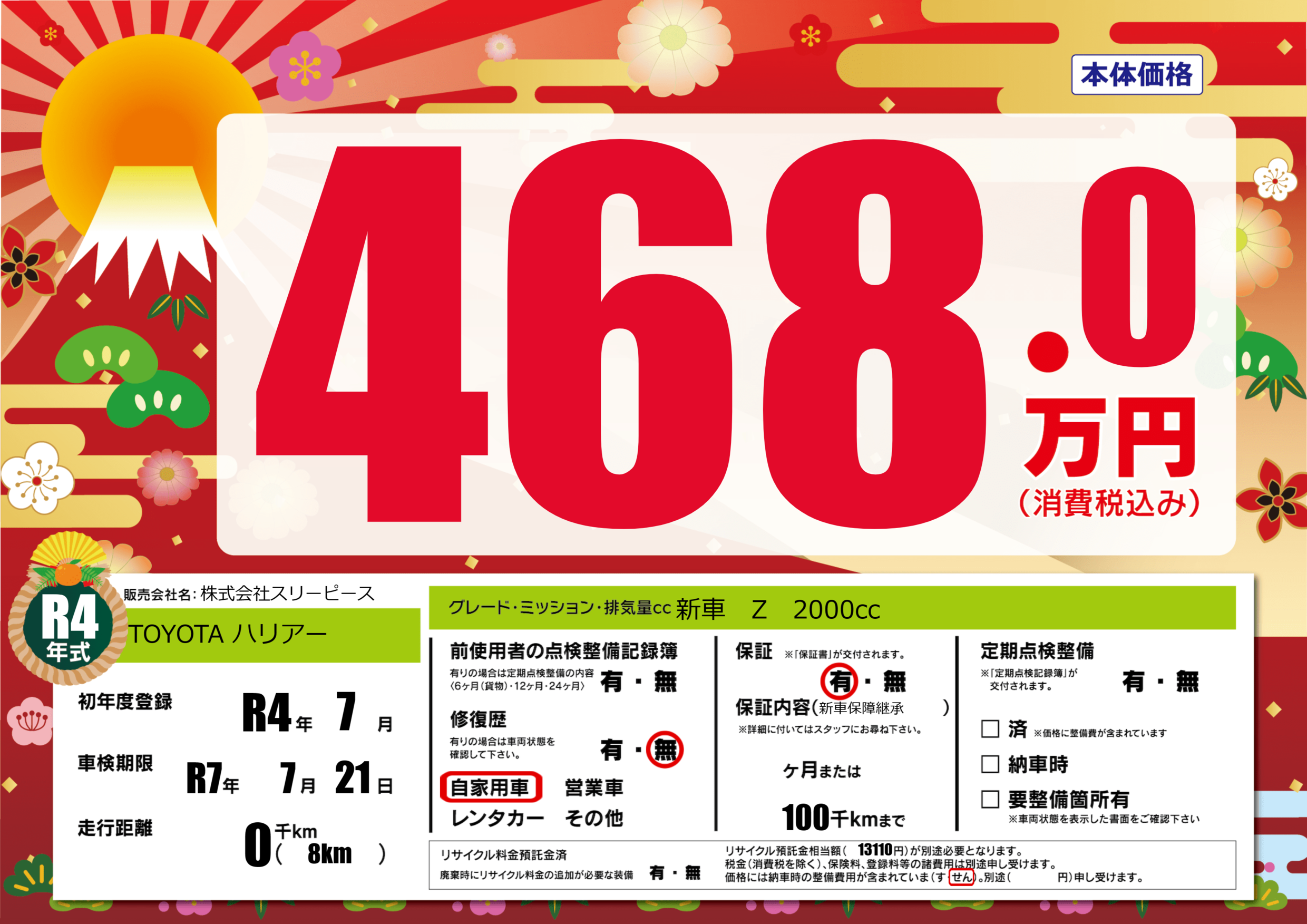 | 車名 | TOYOTA ハリアー | グレード ミッション 排気量 |