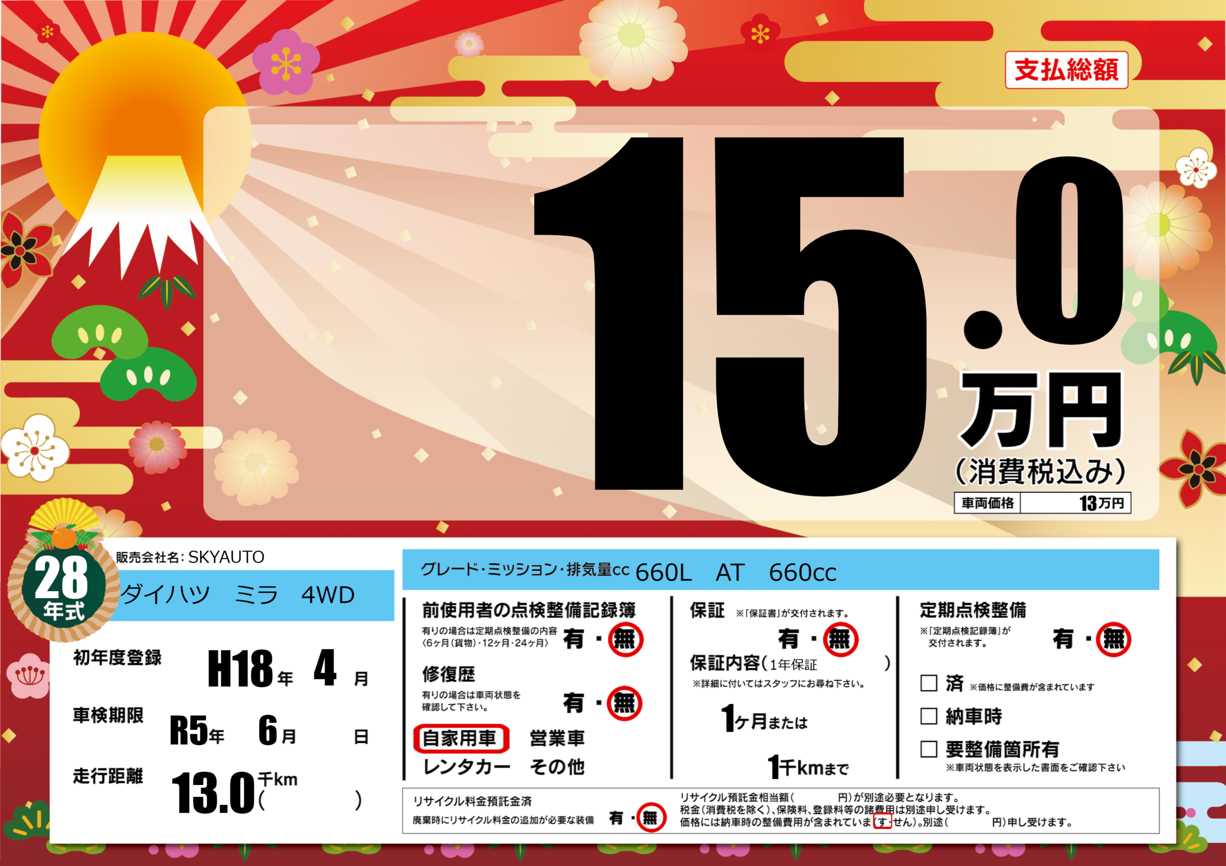 | 車名 | ダイハツ ミラ 4WD | グレード ミッション 排気量 |