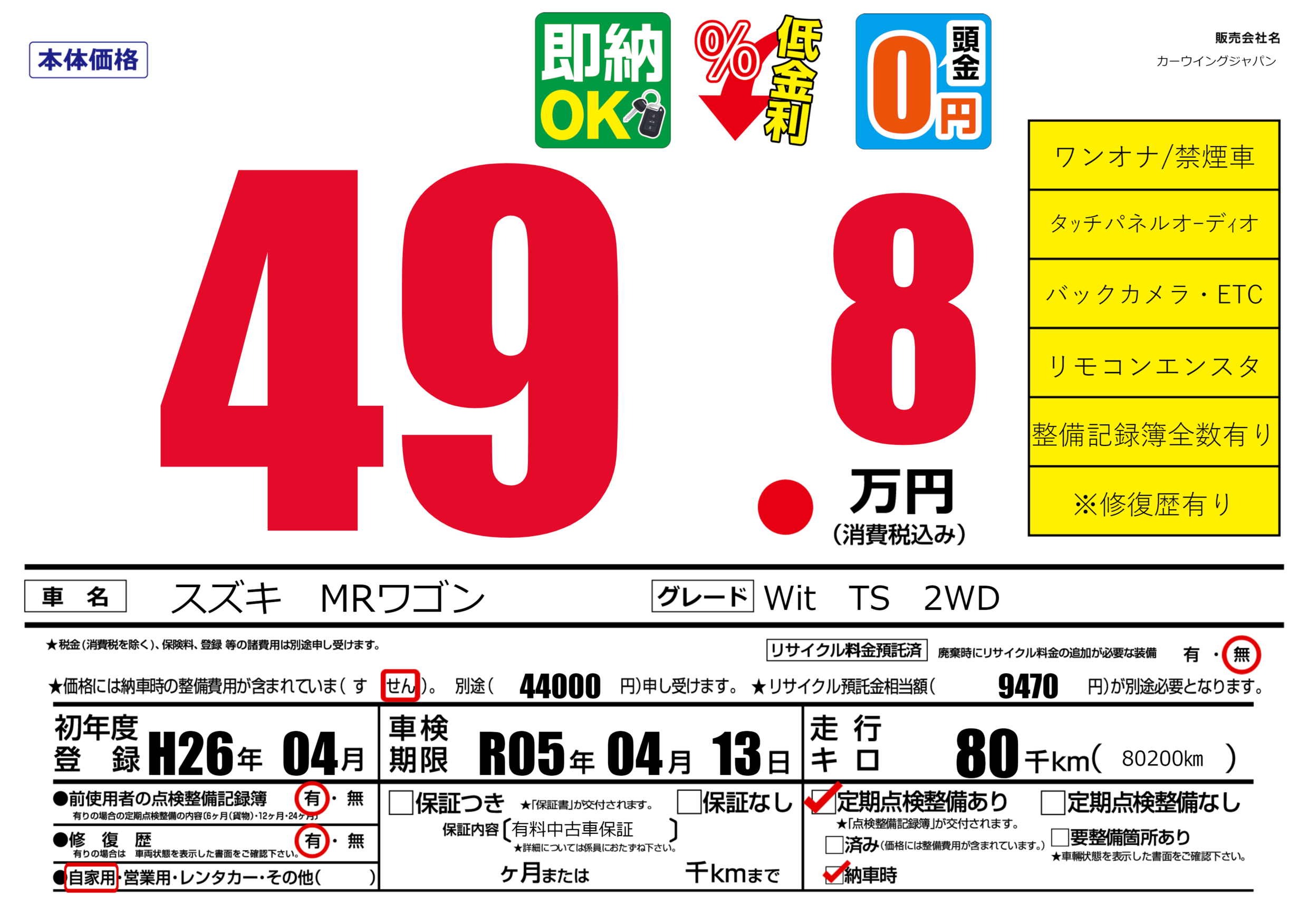 保証なし 保証内容(有料中古車保証) ---ヶ月または()千kmまで |