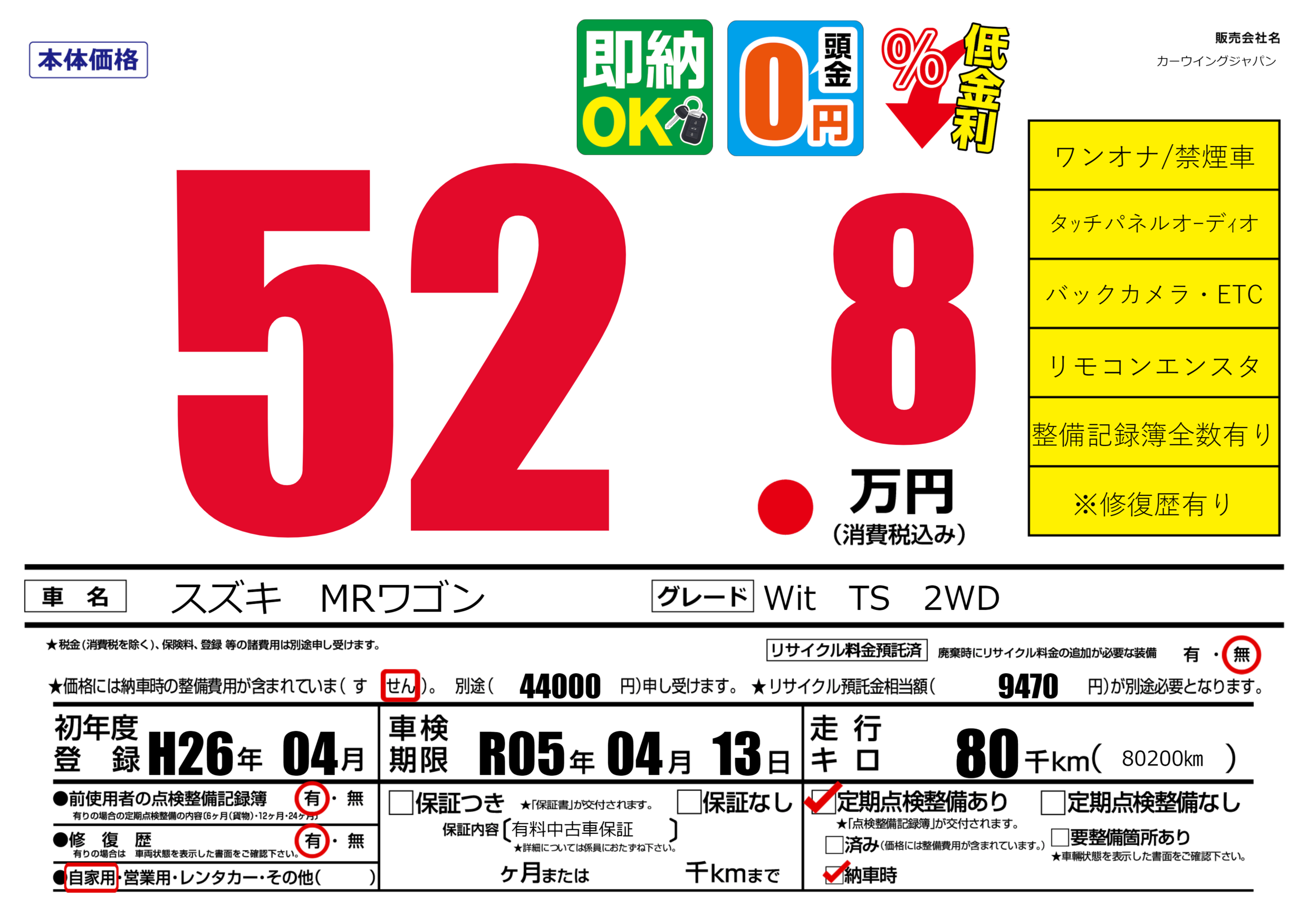 保証なし 保証内容(有料中古車保証) ---ヶ月または()千kmまで |
