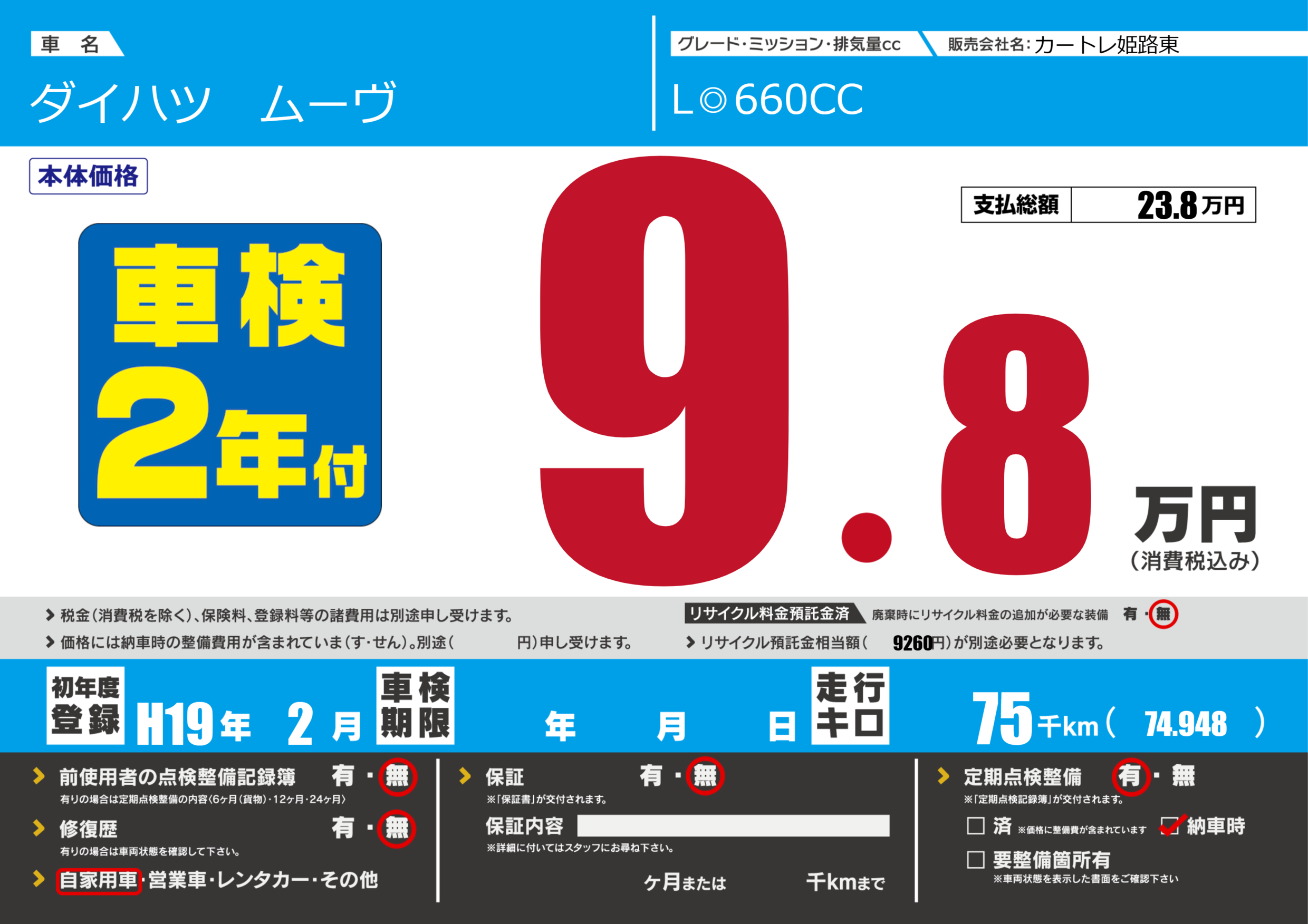 | 走行キロ | 7.5万km | 初年度登録 | H19年2月 |