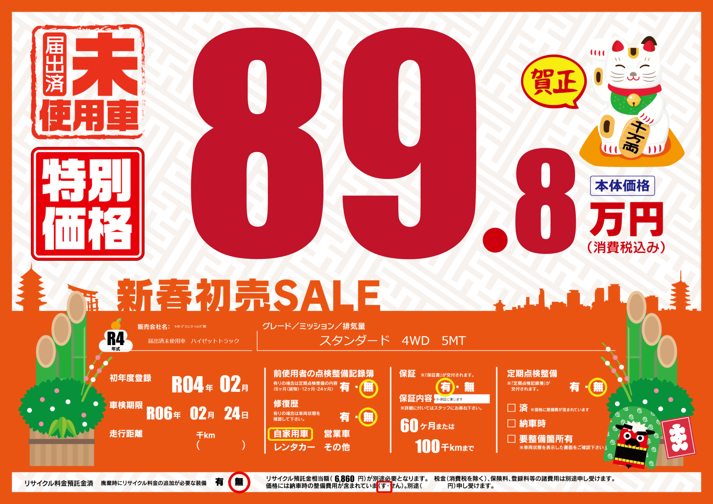 | 車名 | 届出済未使用車 ハイゼットトラック | グレード ミッション 排気量 |