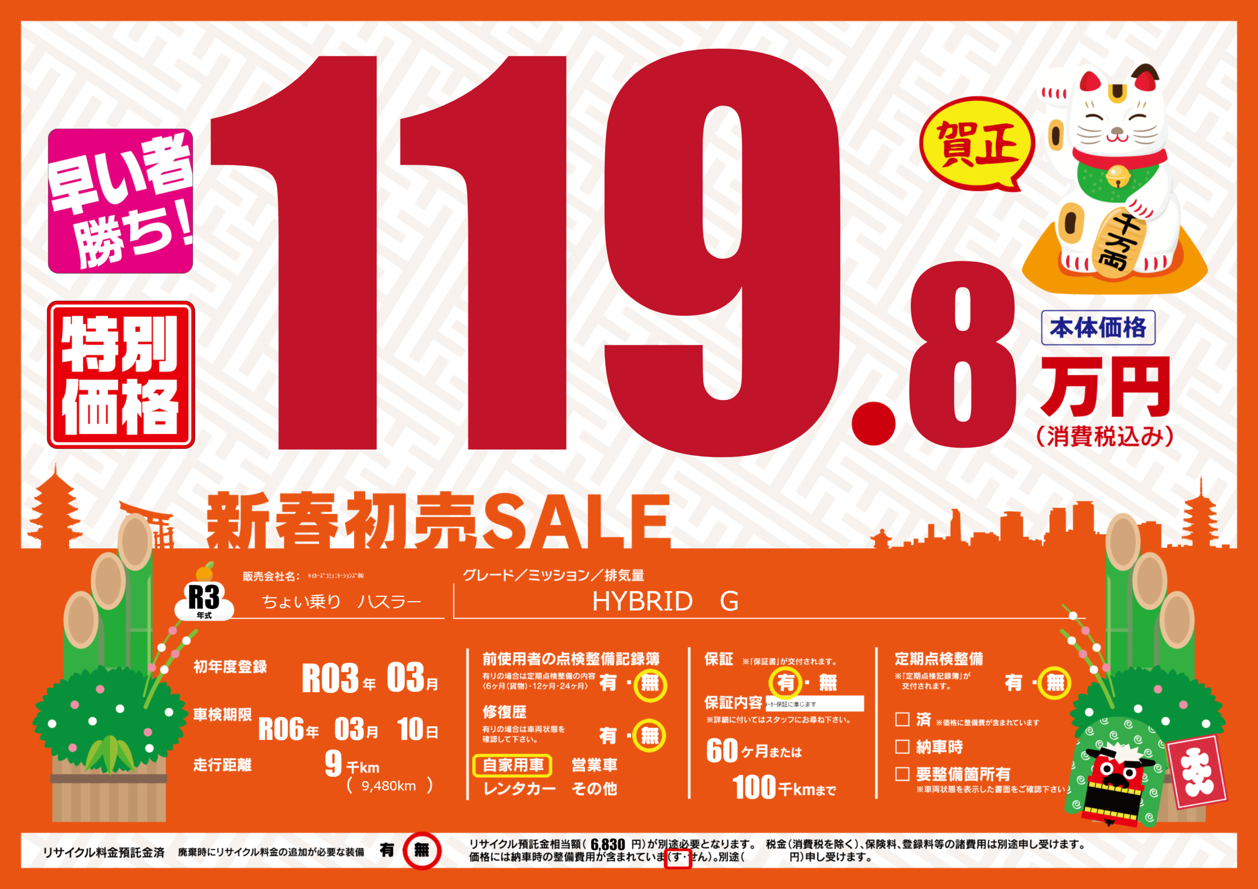 | 車名 | ちょい乗り ハスラー | グレード ミッション 排気量 |