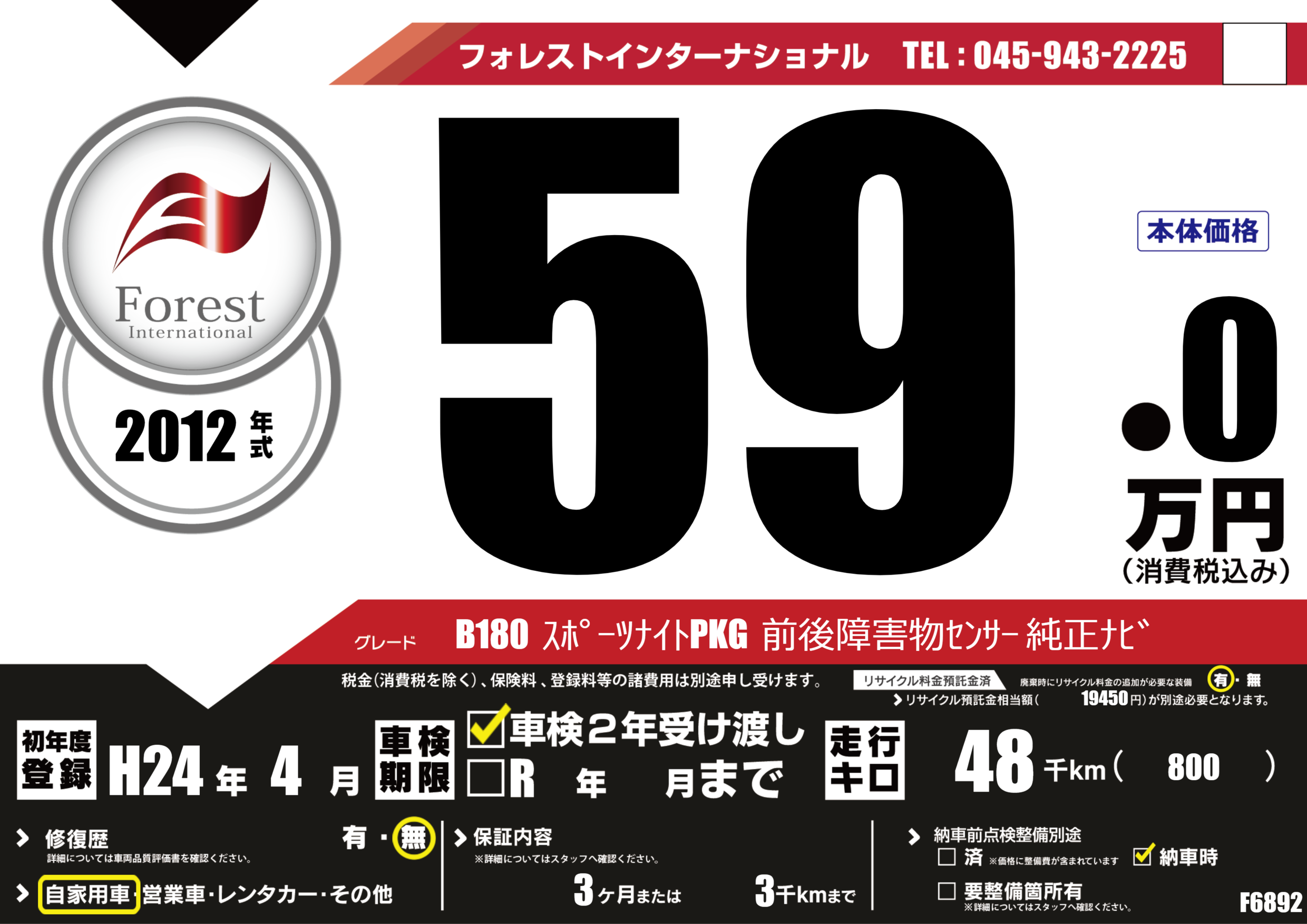 B180 スポーツナイトPKG 前後障害物センサー 純正ナビ |