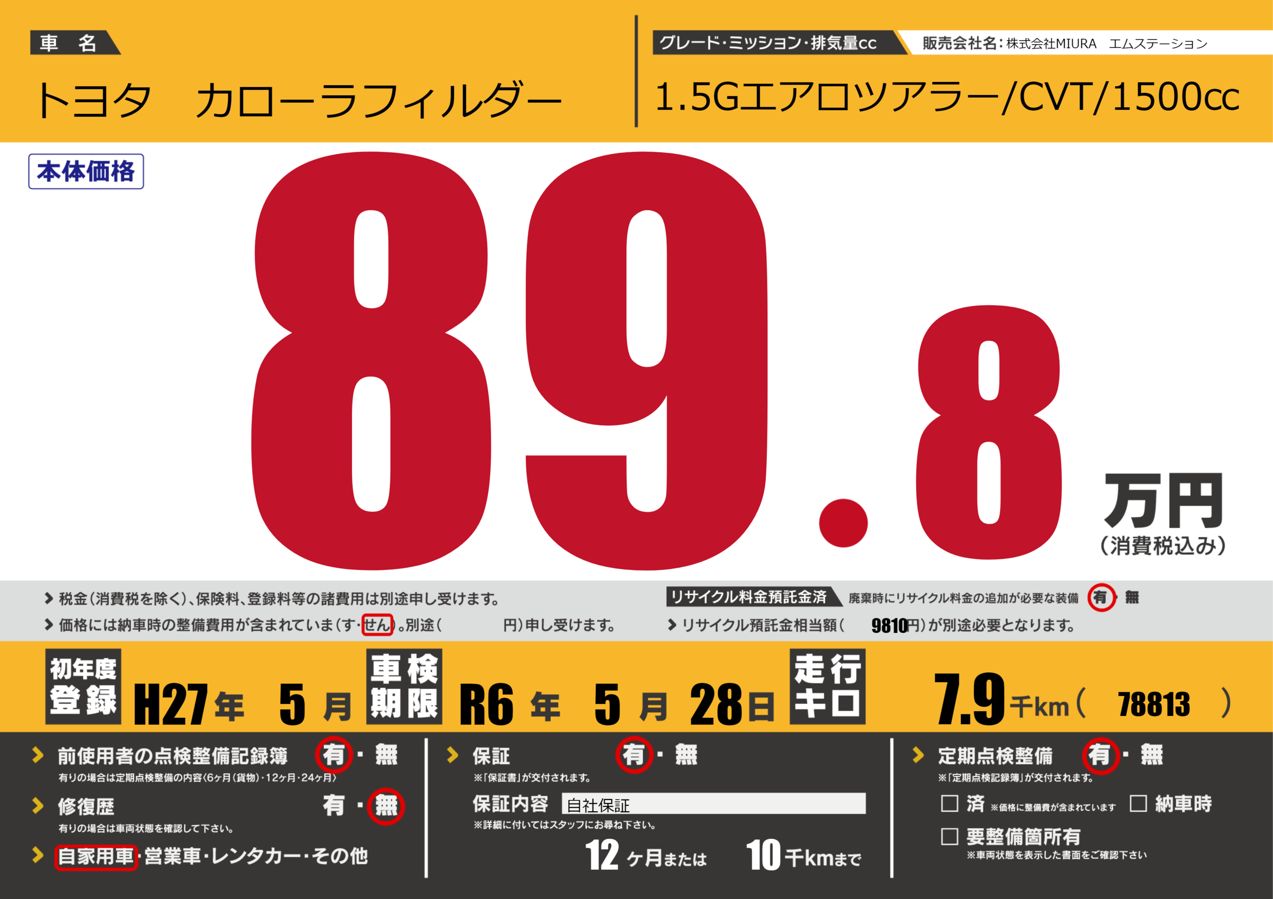 | 車名 | トヨタ カローラフィルダー | グレード ミッション 排気量 |