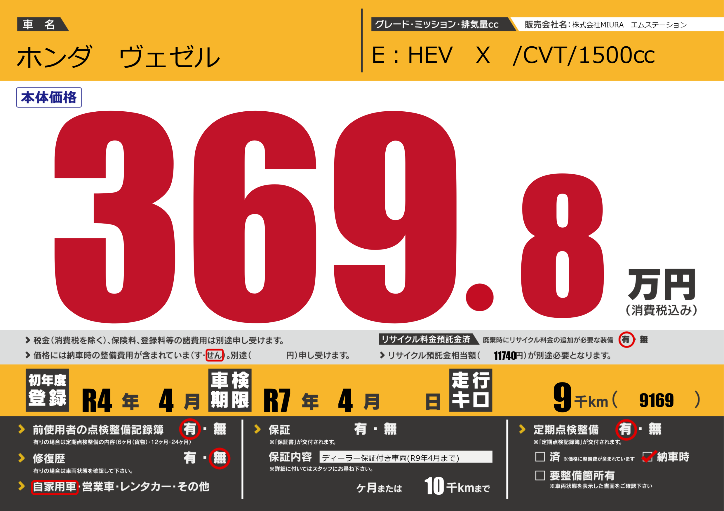 | 車名 | ホンダ ヴェゼル | グレード ミッション 排気量 |