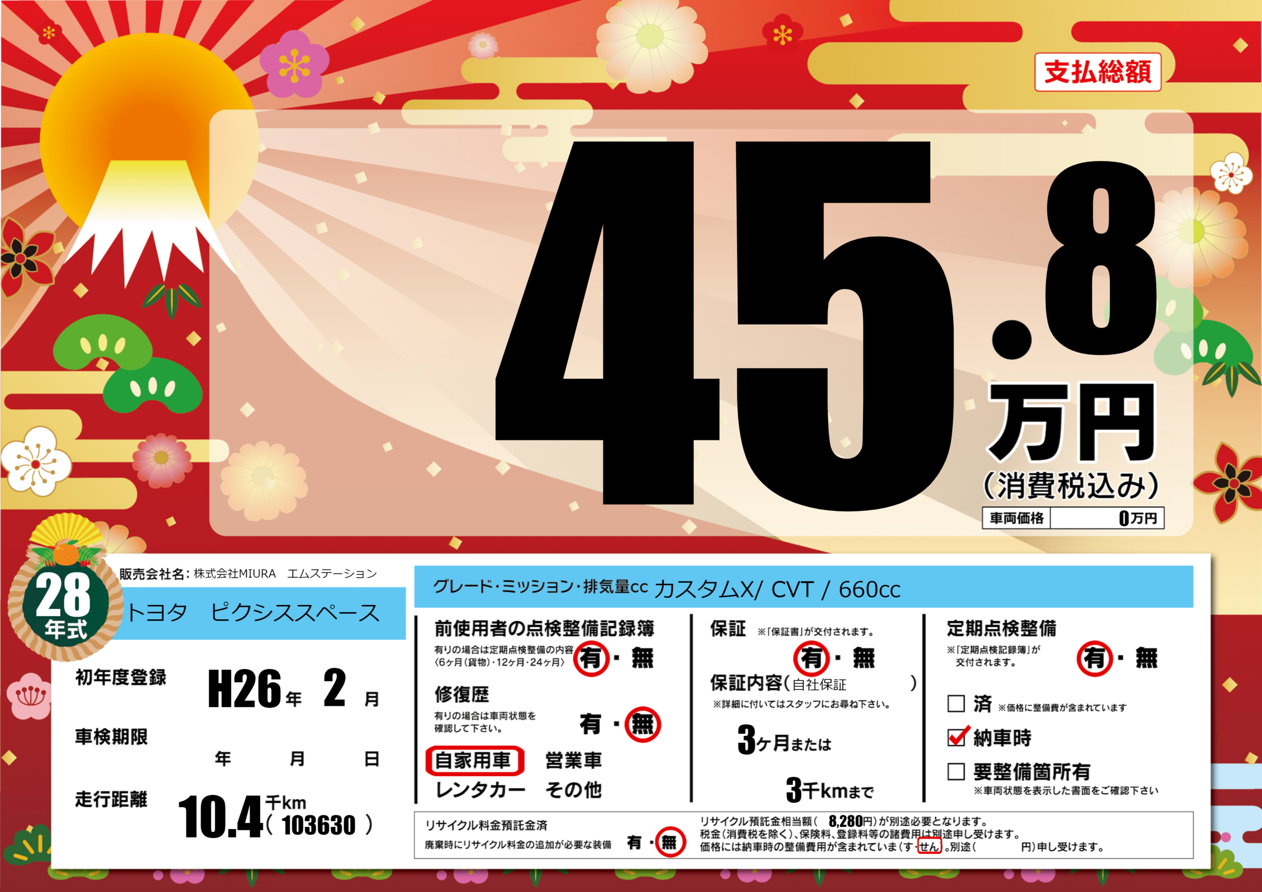 | 走行キロ | 1万km | 初年度登録 | H26年2月 |