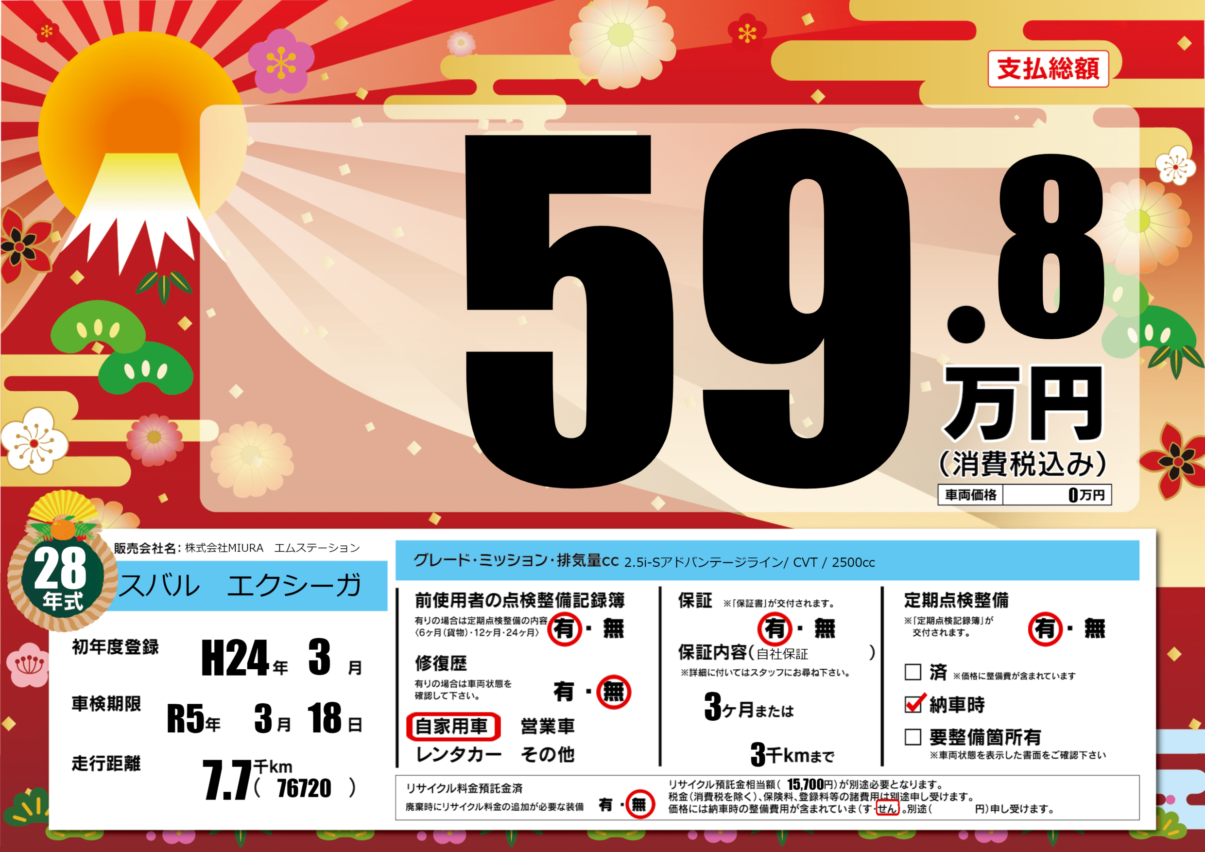 | 走行キロ | 0.7万km | 初年度登録 | H24年3月 |