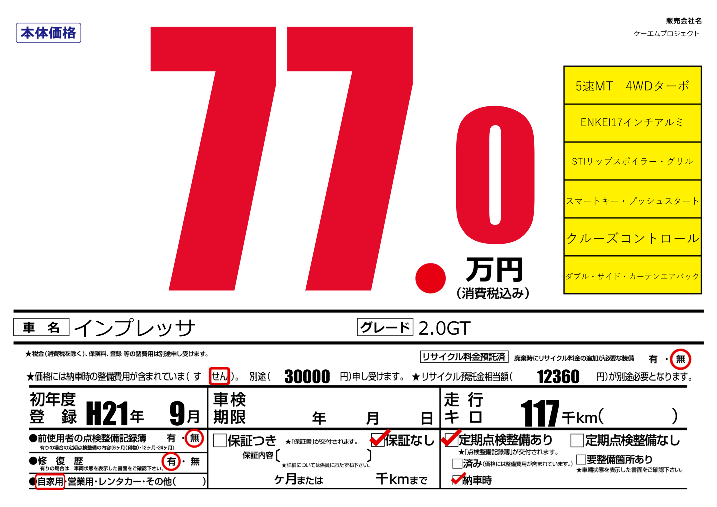 | 車名 | インプレッサ | グレード ミッション 排気量 |