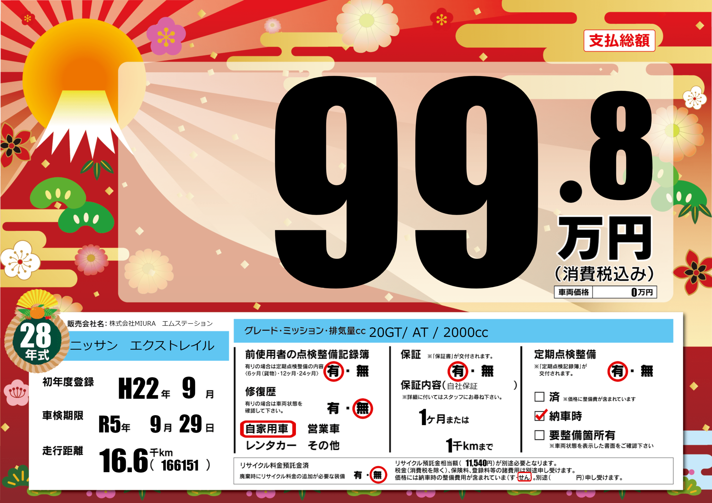 | 車名 | ニッサン エクストレイル | グレード ミッション 排気量 |
