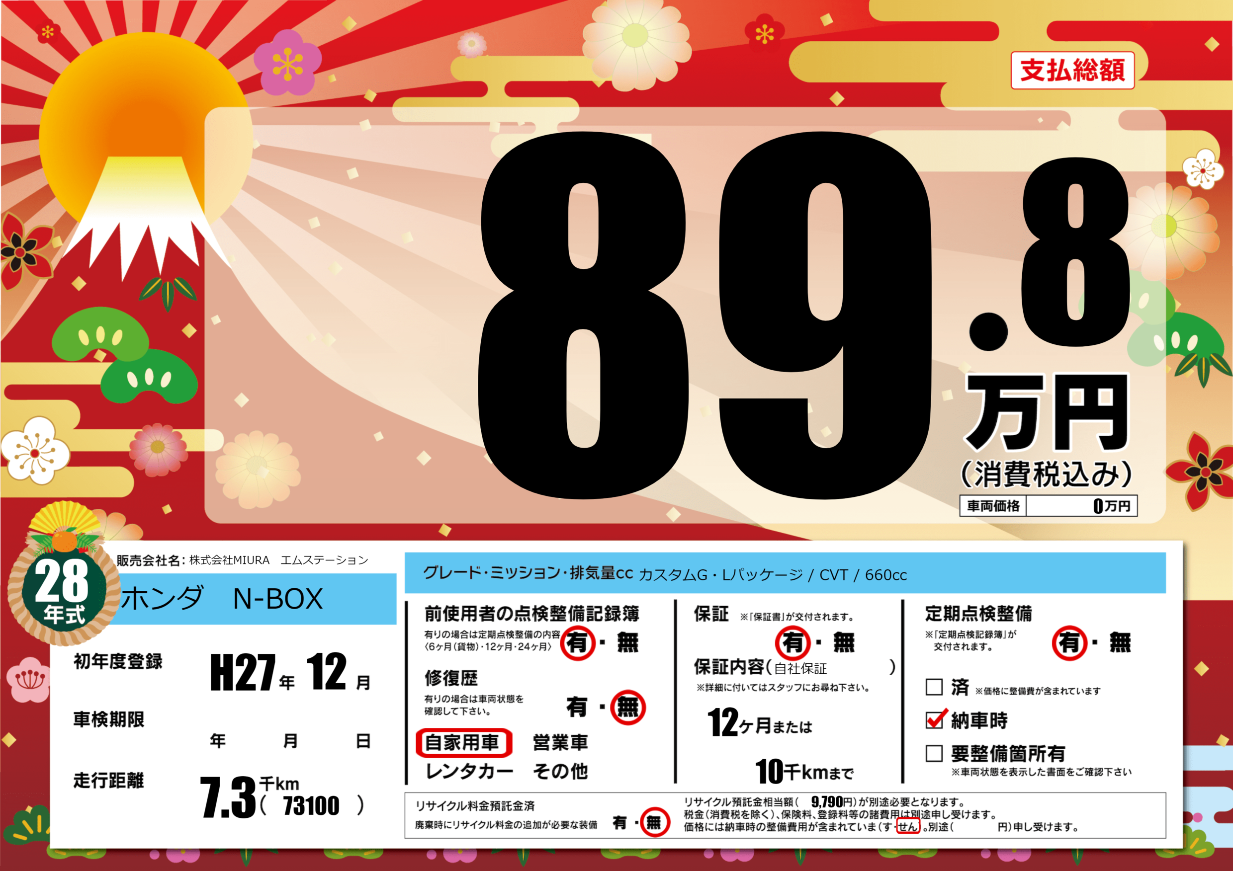 | 車名 | ホンダ N-BOX | グレード ミッション 排気量 |