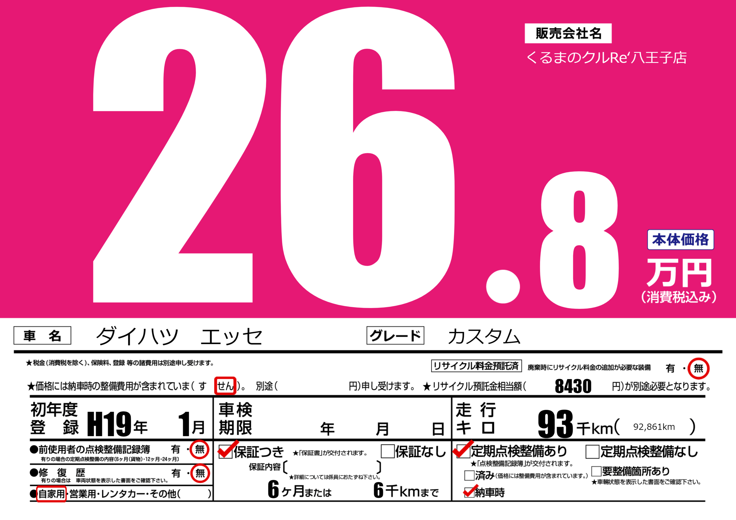 | 車名 | ダイハツ エッセ | グレード ミッション 排気量 |