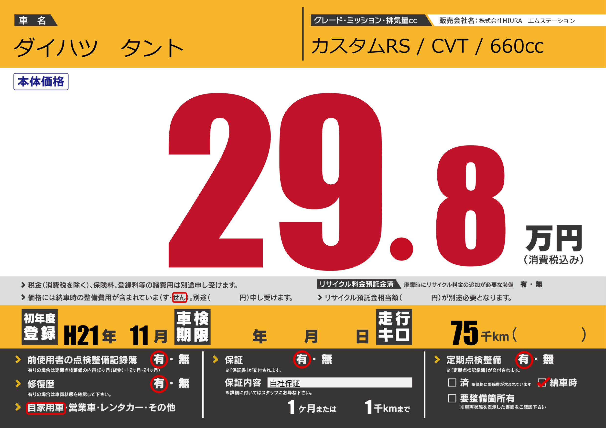 保証付き 保証内容(自社保証) 1ヶ月または(1)千kmまで |