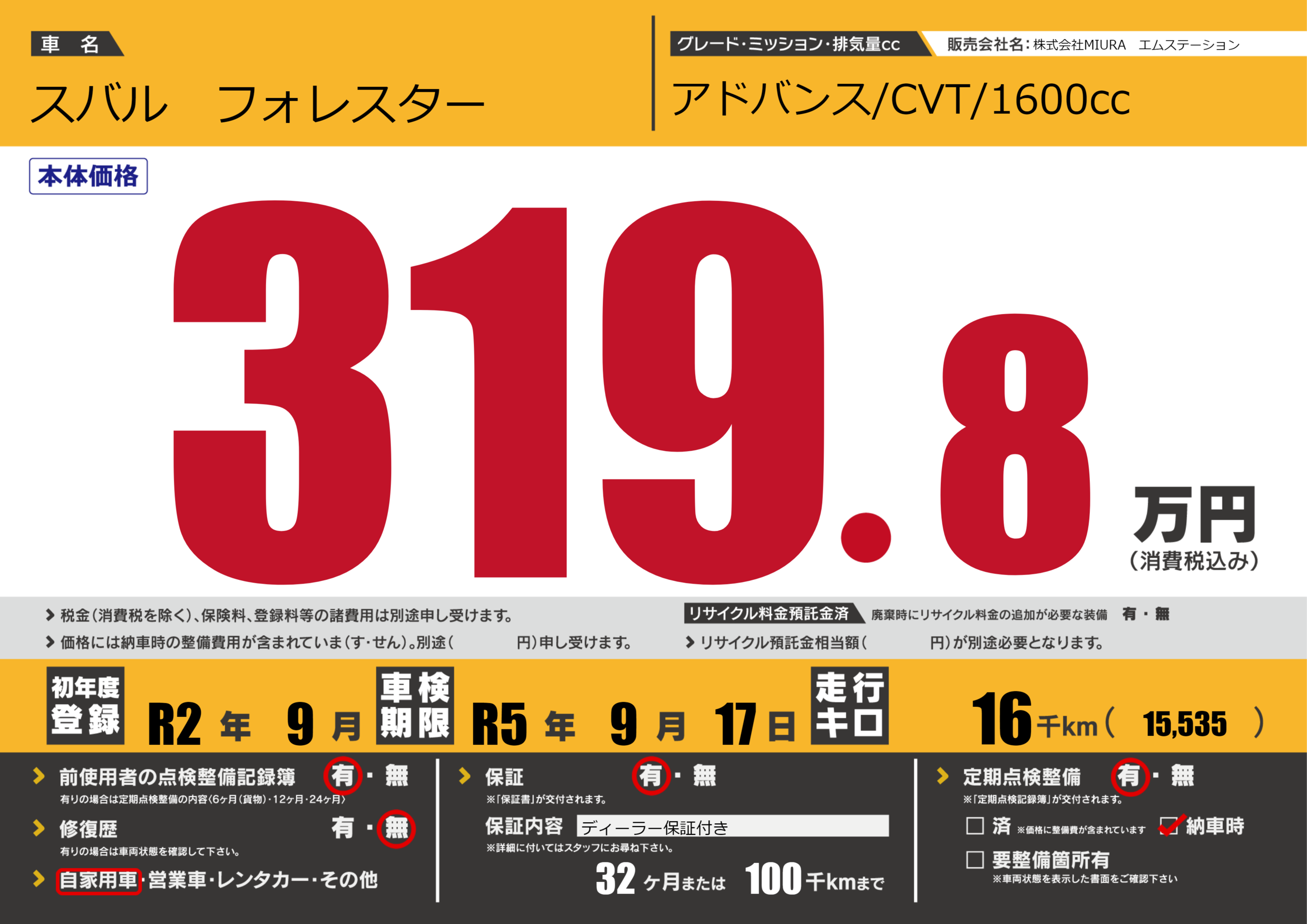 | 車名 | スバル フォレスター | グレード ミッション 排気量 |