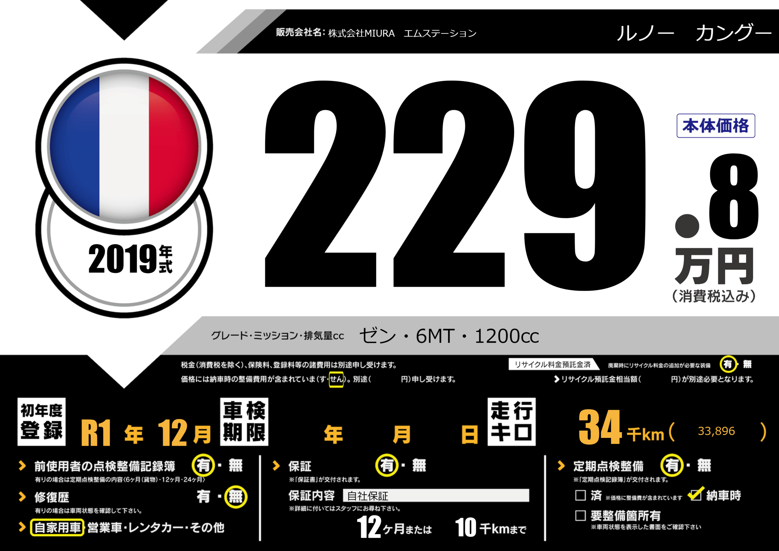 | 走行キロ | 3.4万km | 初年度登録 | R1年12月 |