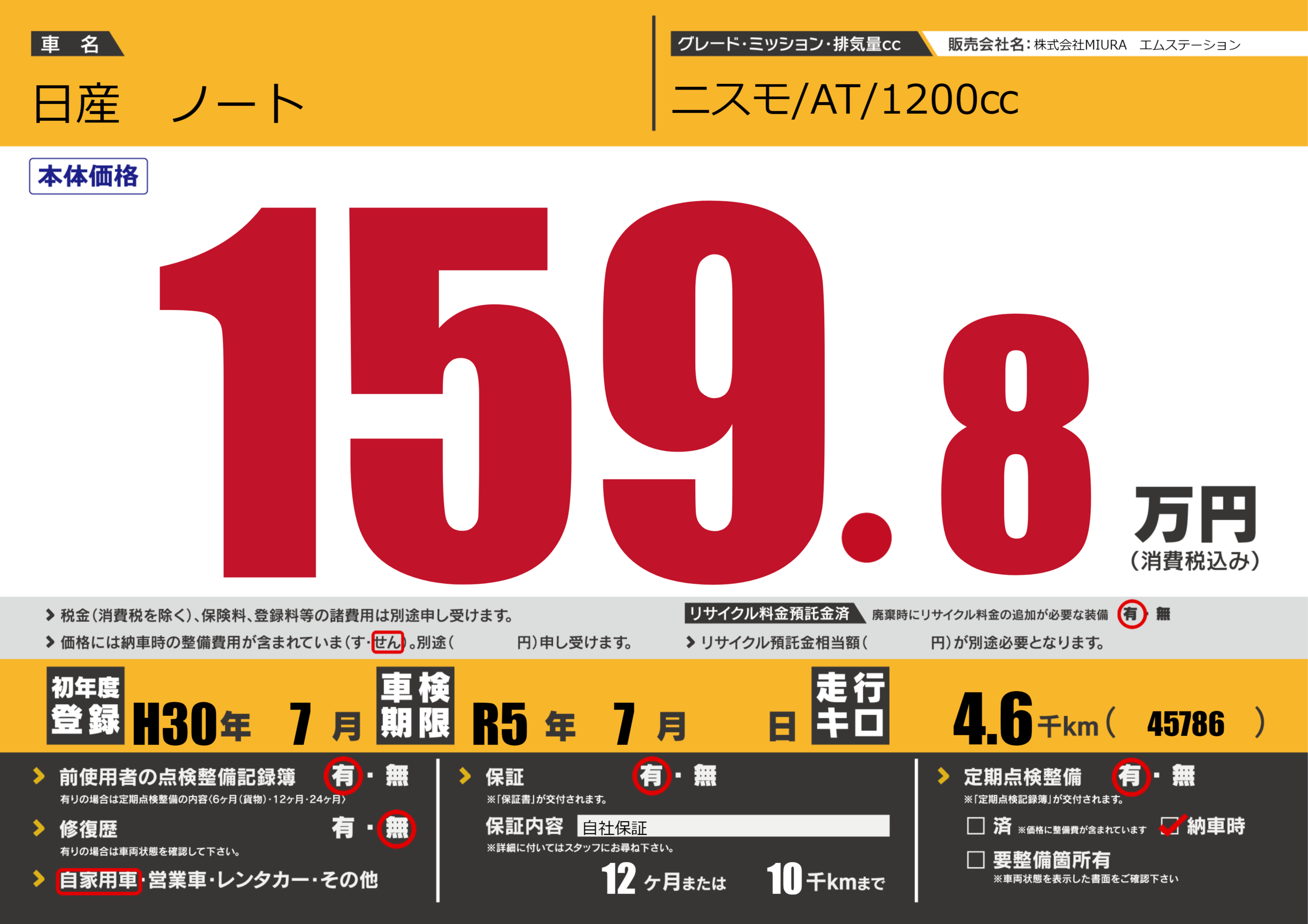 保証付き 保証内容(自社保証) 12ヶ月または(10)千kmまで |