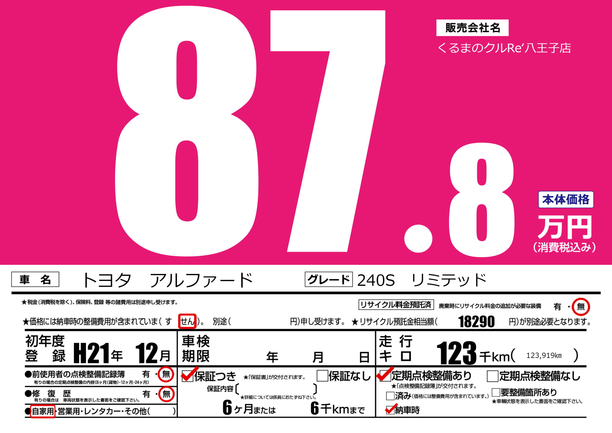 | 車名 | トヨタ アルファード | グレード ミッション 排気量 |
