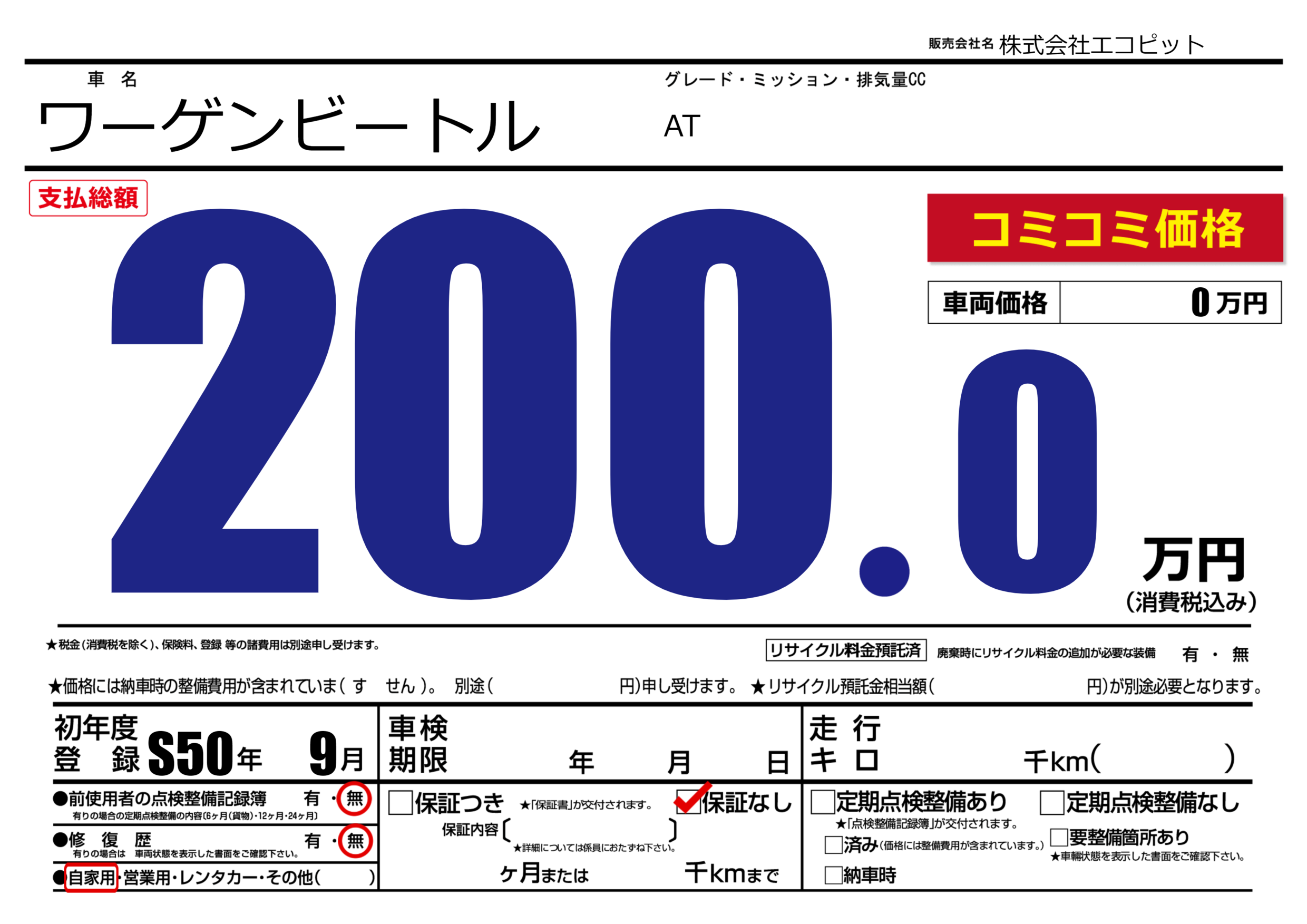 | 車名 | ワーゲンビートル | グレード ミッション 排気量 |