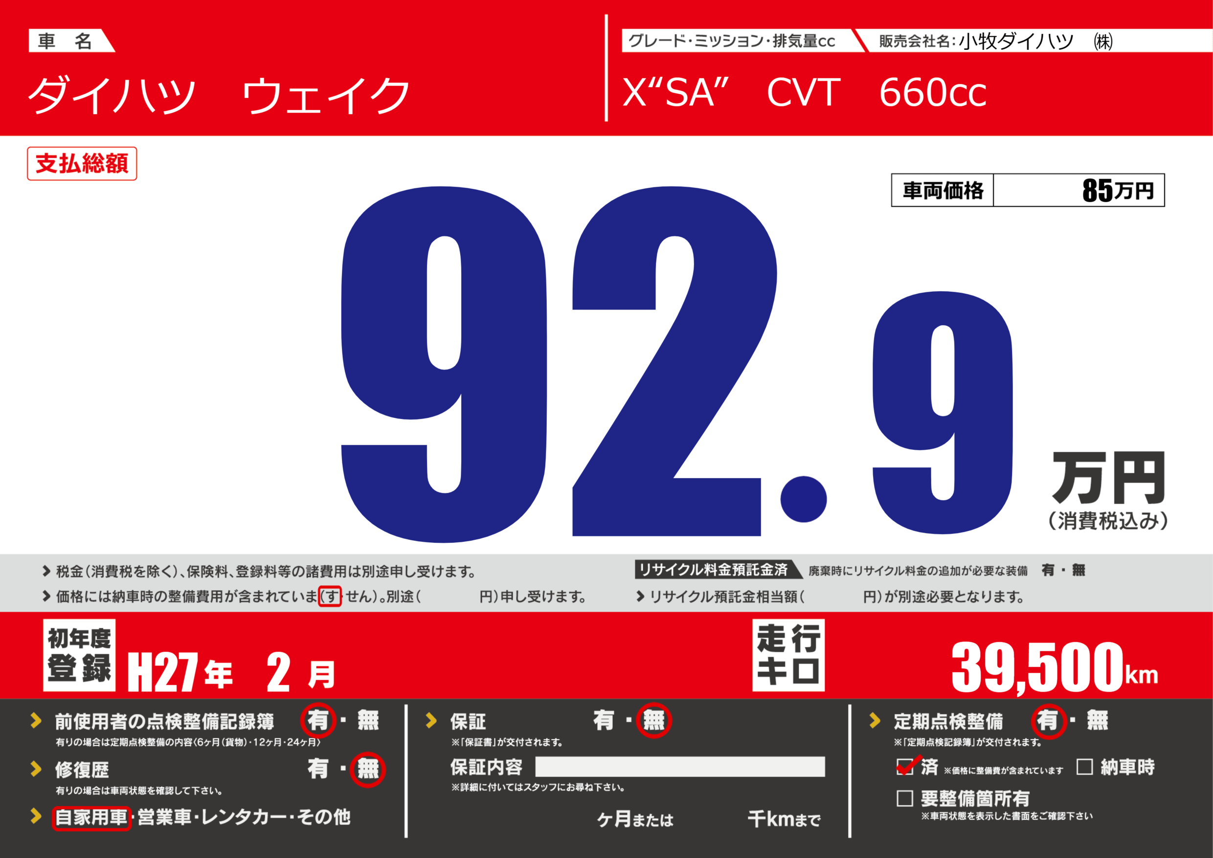 | 定期点検整備 | 定期点検整備あり 定期点検整備済み | ||