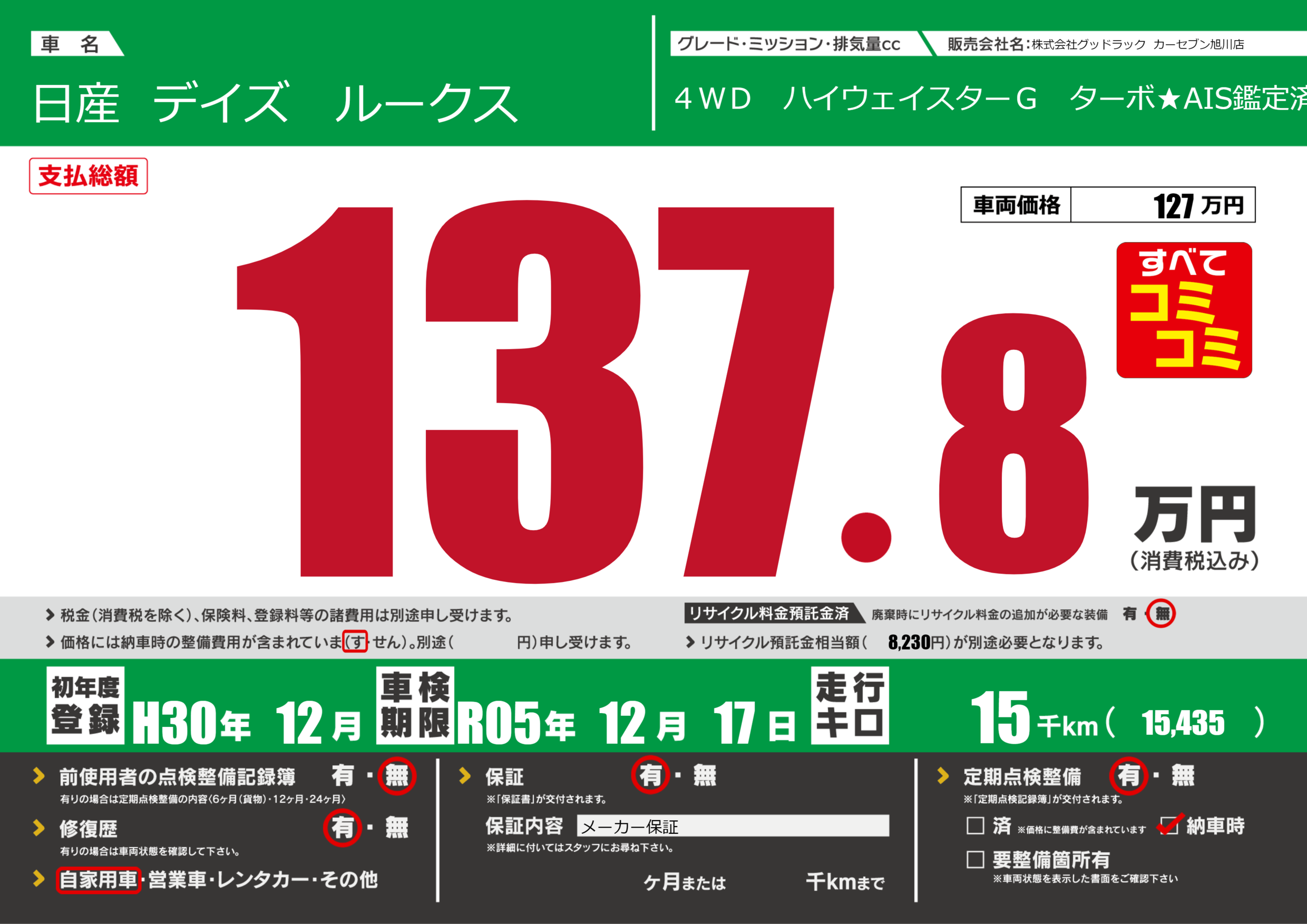 | 走行キロ | 1.5万km | 初年度登録 | H30年12月 |