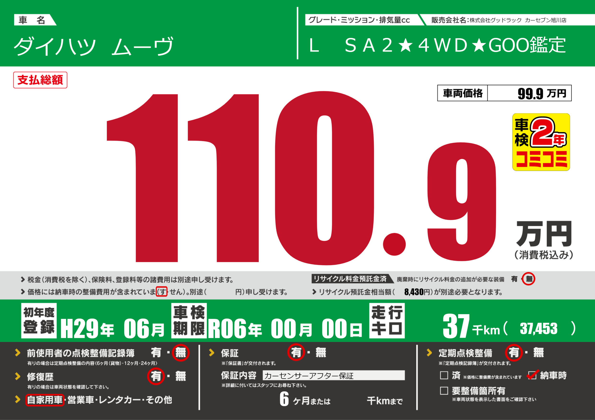 | 走行キロ | 3.7万km | 初年度登録 | H29年06月 |