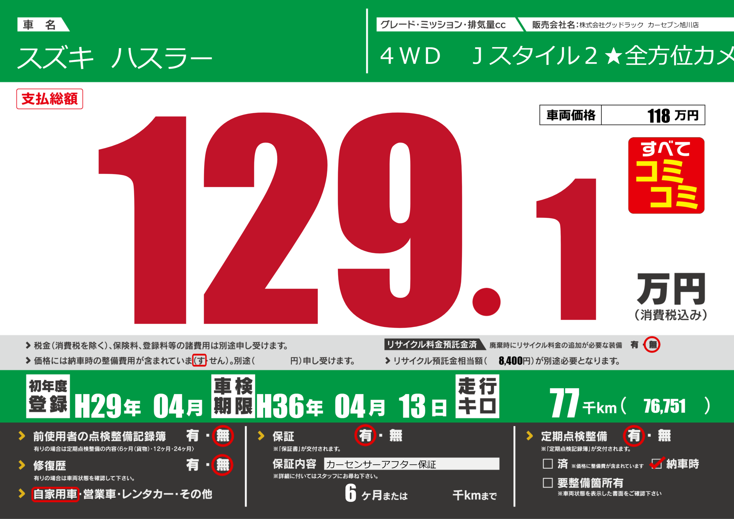 | 走行キロ | 7.7万km | 初年度登録 | H29年04月 |